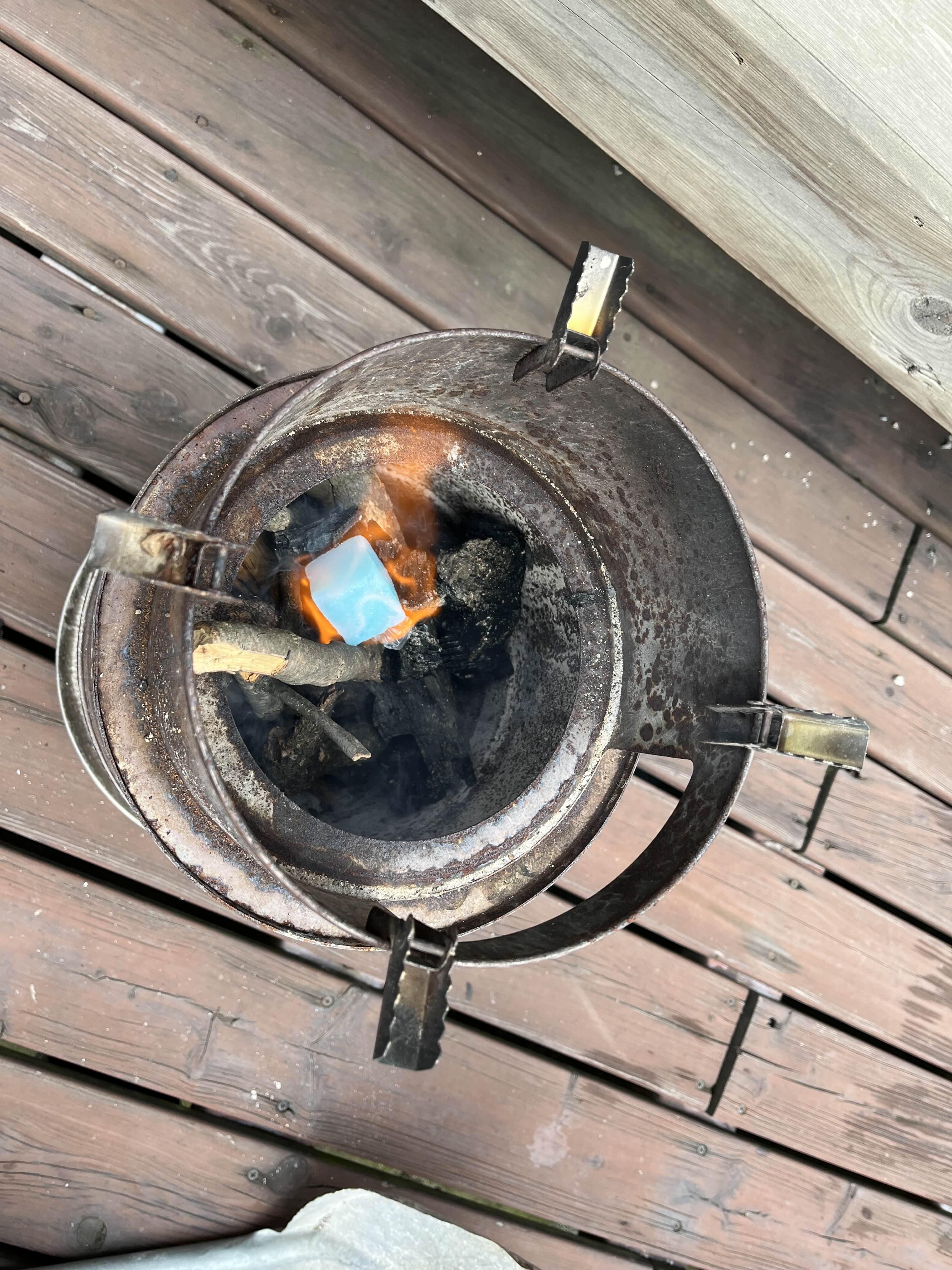 잔가지를 계속 넣고, 옮겨보고, 손선풍기까지 동원해서 겨우 불을 붙였지만 액체 불쏘시개보다는 만족스럽다.