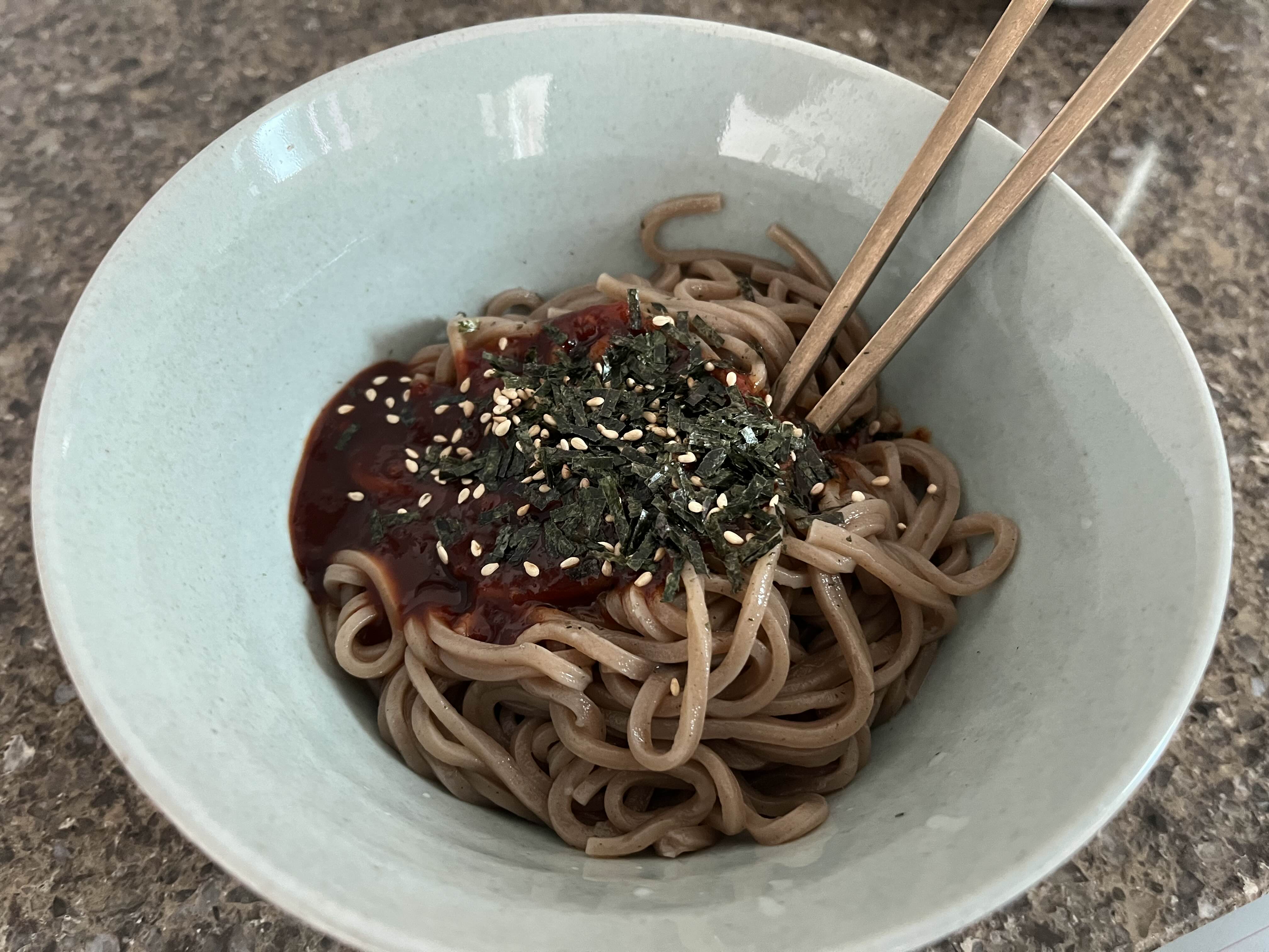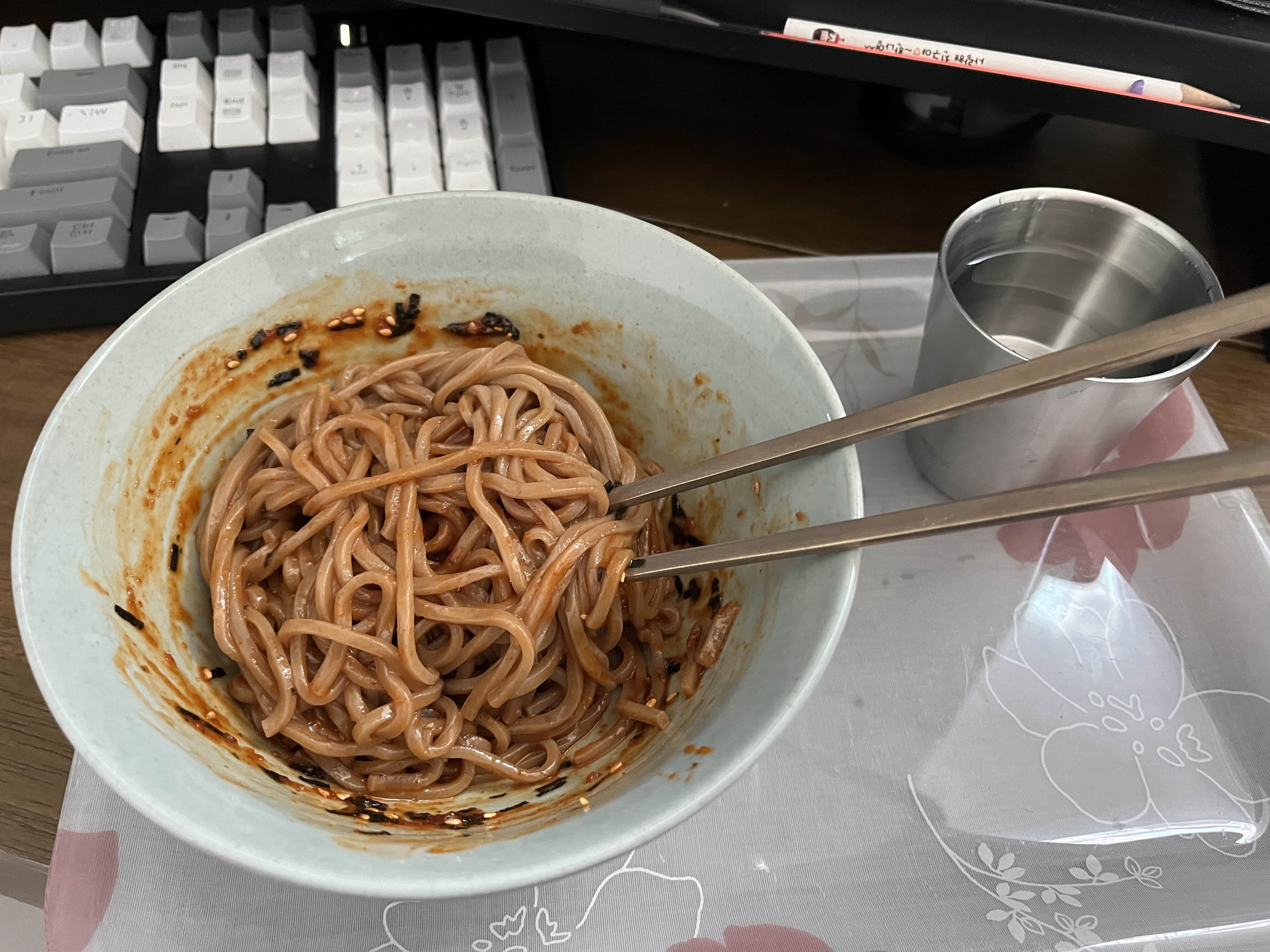 면은 다소 굵고 퍽퍽한 편이다. 내가 잘못 삶았나? 얼음으로 쌔렸어야했나? 덜 삶아야했나?