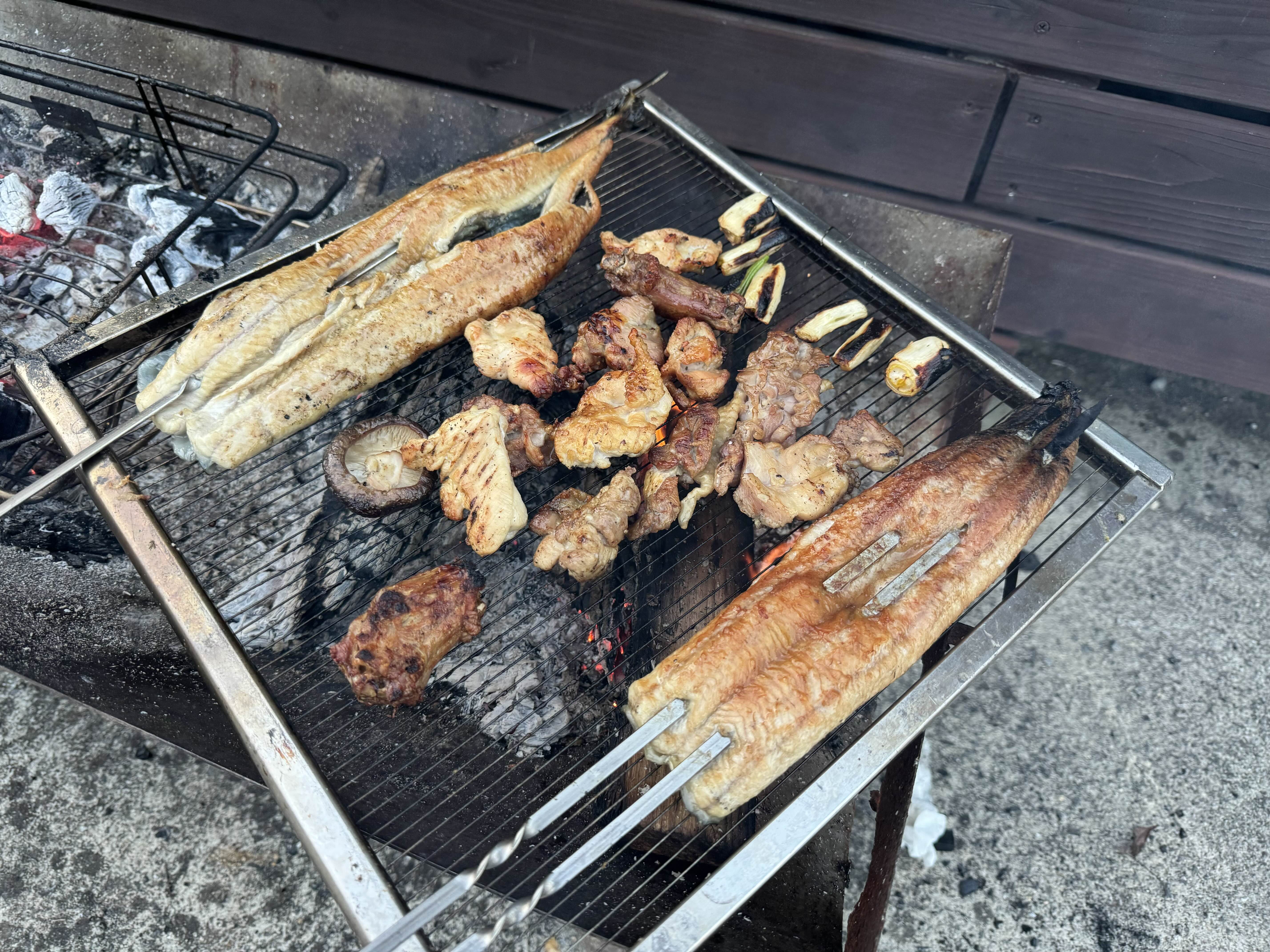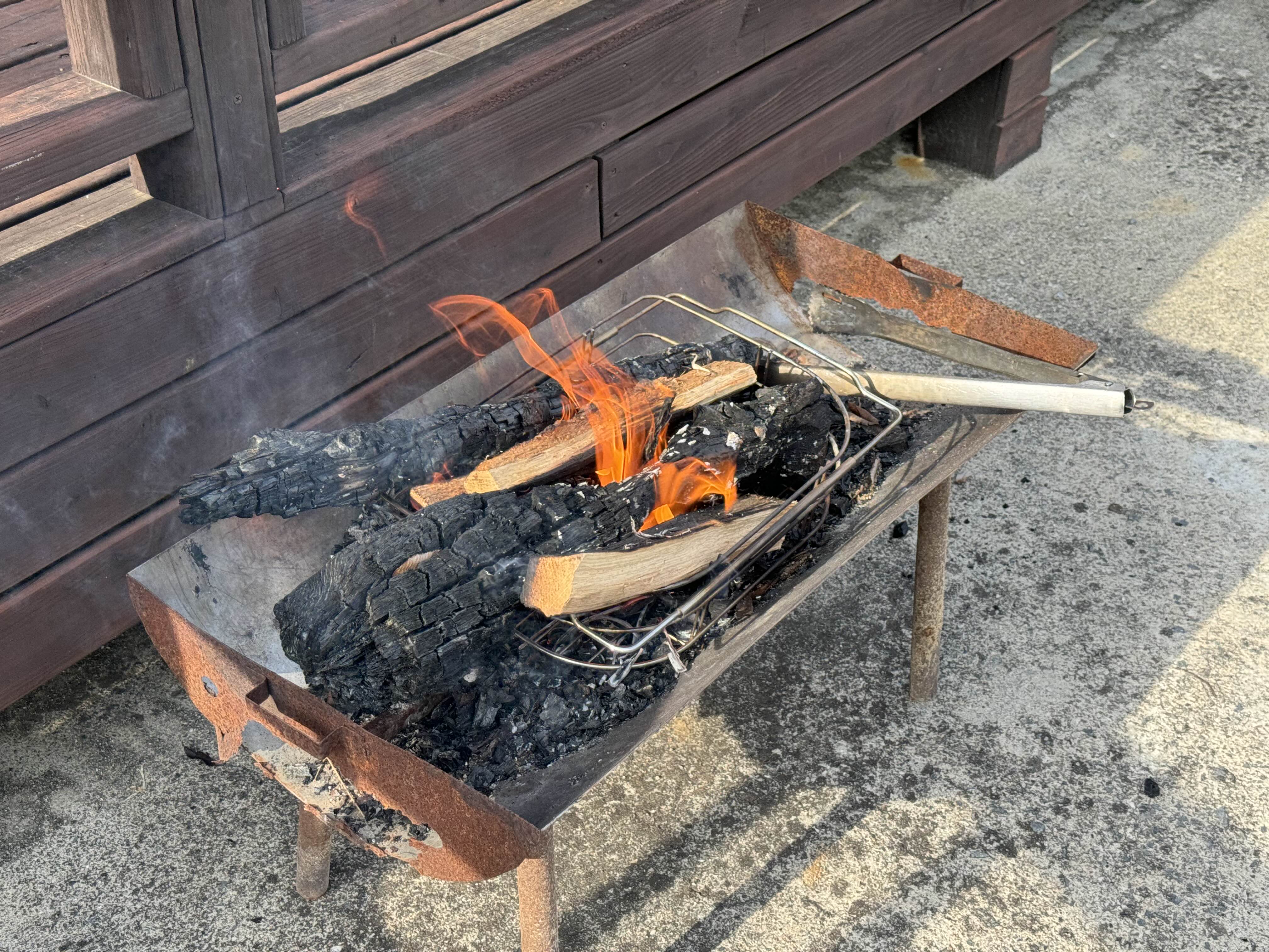 기존에 있던 숯에 장작 몇개 넣어 가스로 화력을 더했습니다.