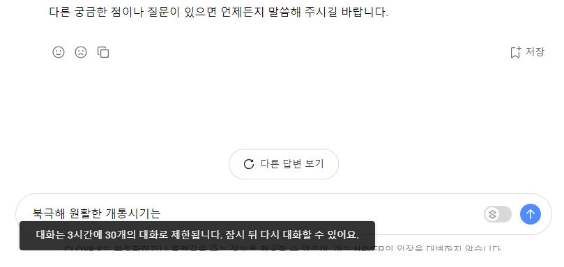 컴퓨팅 자원의 한계 때문인지 3시간당 30개의 대화로 제한됩니다라고 합니다.