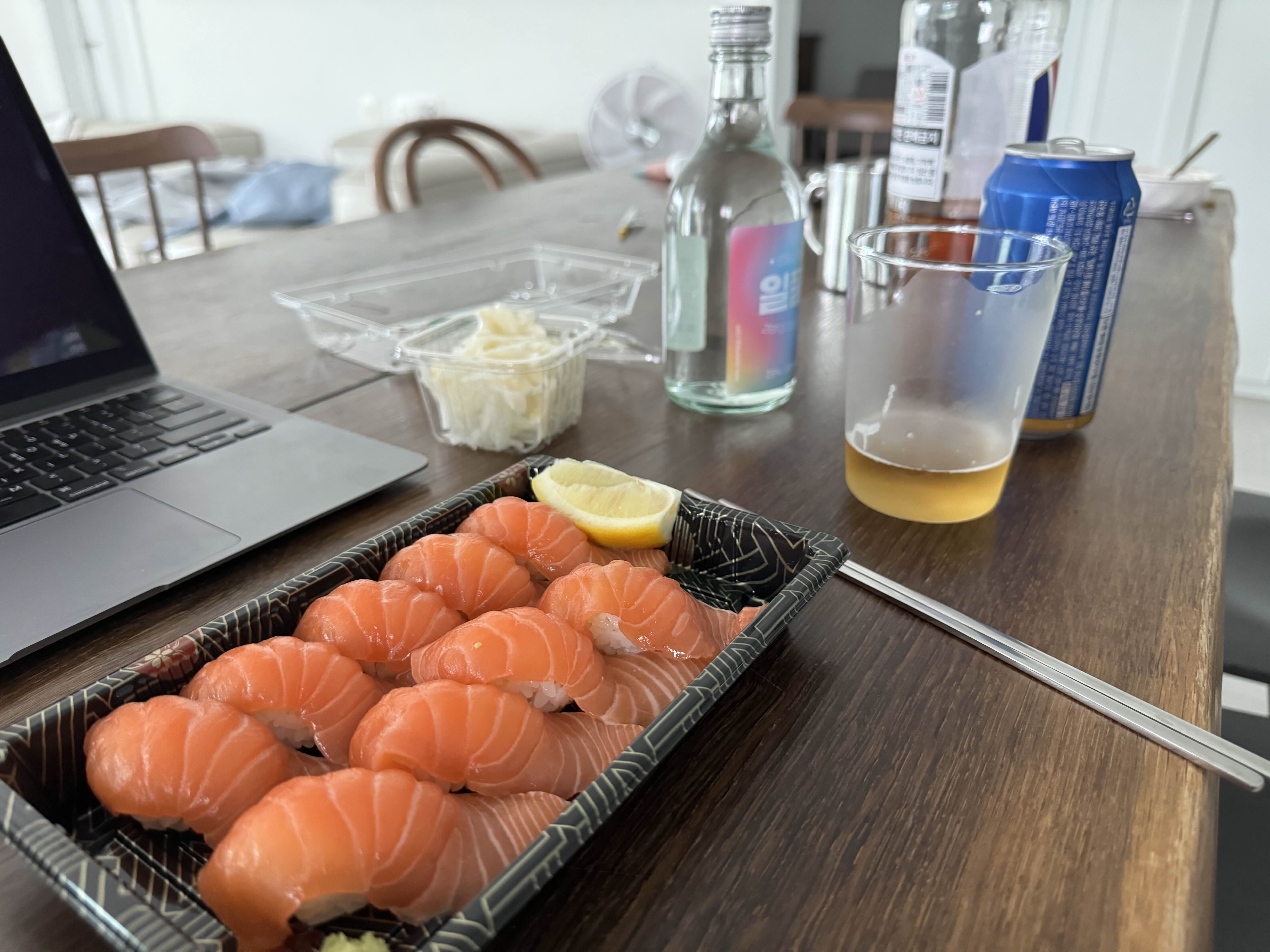 간만에 휴가라서 낮술을 한잔 했습니다. 이런 조건에 초밥과 낮술은 못참지요. 무리하진 않고 작은 맥주캔 1개와 소주 1/3병을 마셨는데 역시 자유로운 해방감은 최고네요.