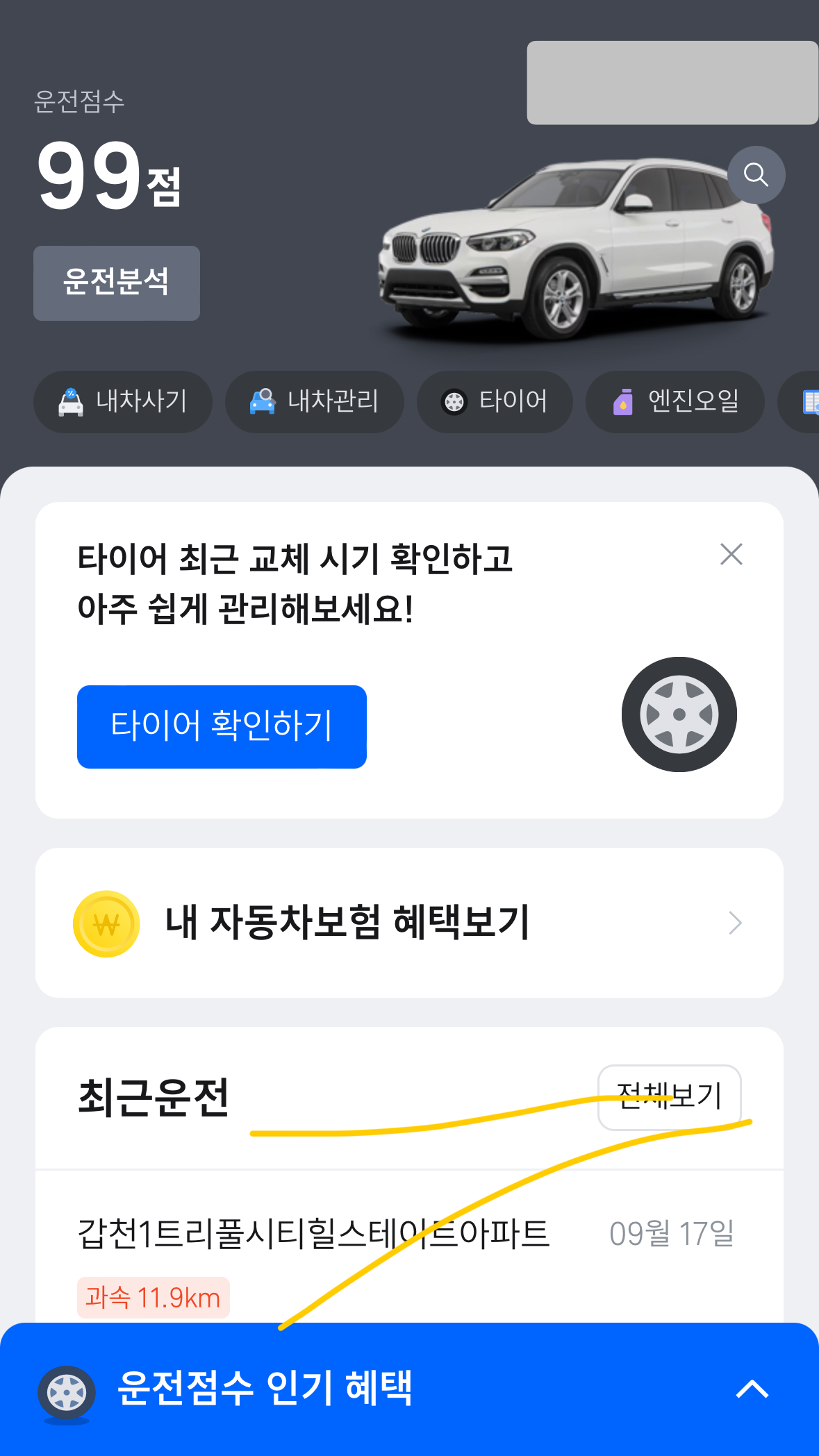 점점 평균값이 올라가더니 드디어 99점까지 올라오게 되네요. 실제로 삼성화재 보험갱신시 큰 혜택을 보았으니 아주 이득이죠. ㅎㅎ 최근 소소한 과속도 있었지만 이제는 왠만하면 과속을 안하는 편입니다. 아주 특수한 상황에서만 저러는데 많지는 않아요. ㅎㅎ