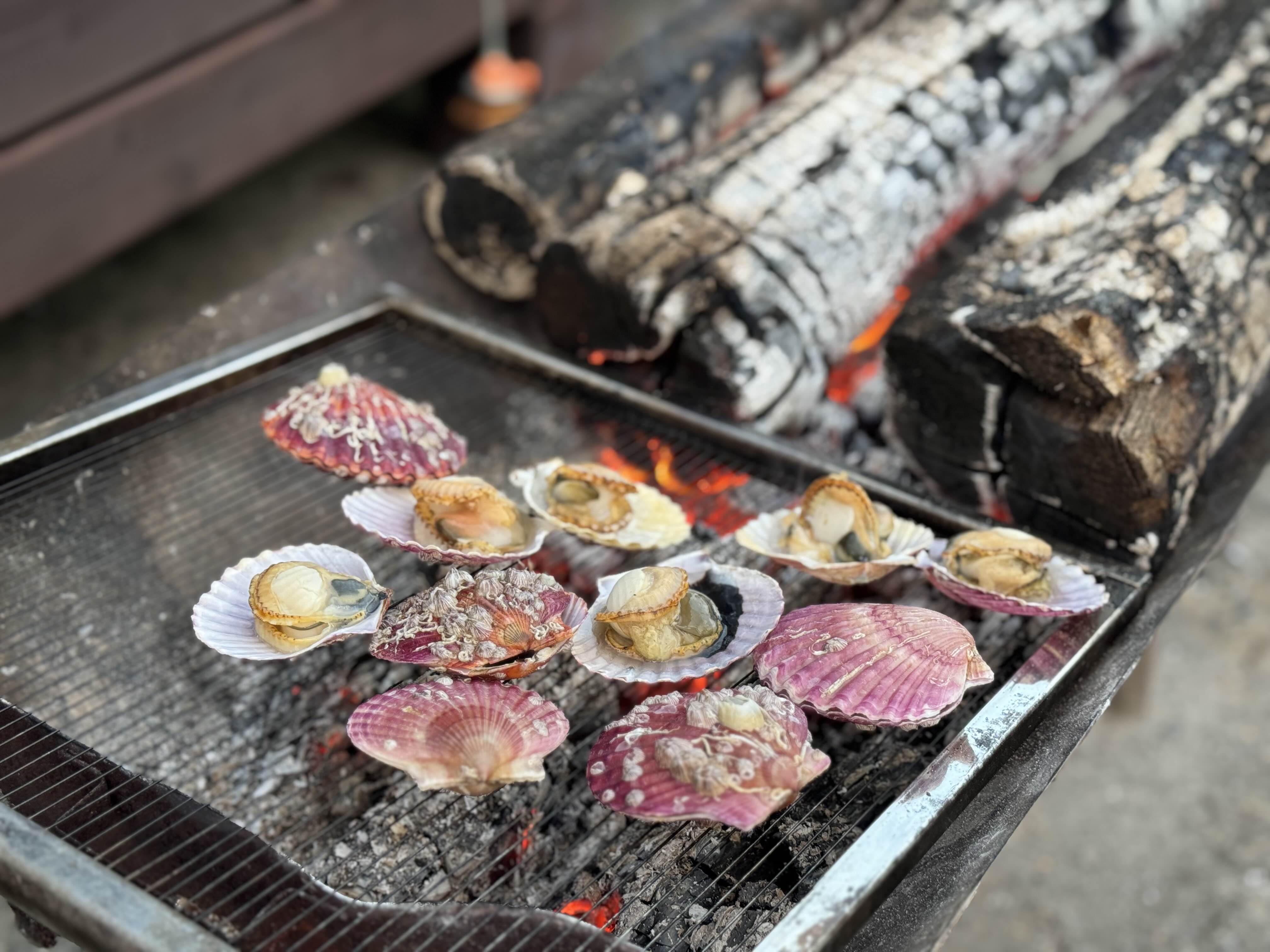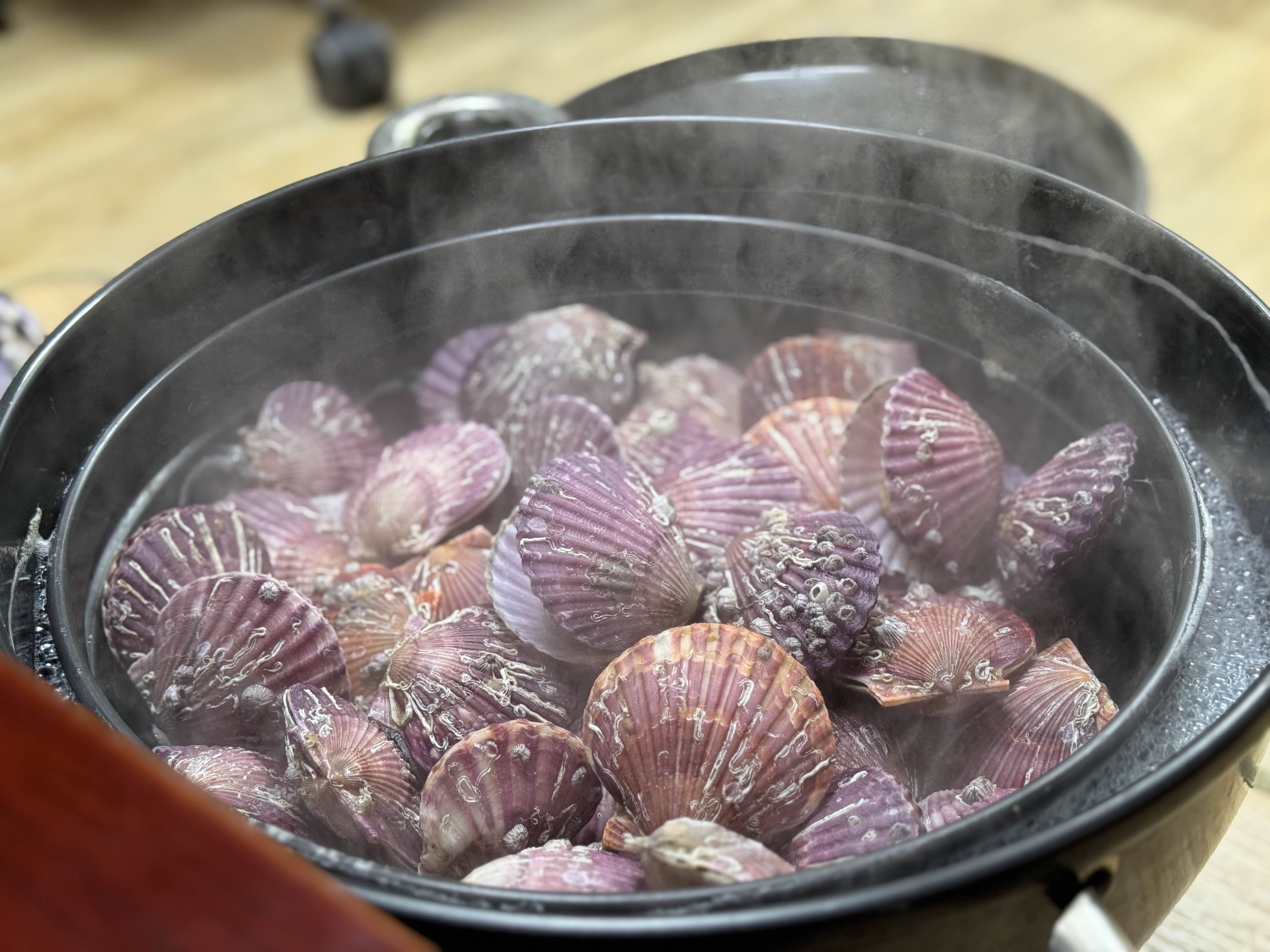 익자마자 입을 쩍쩍 벌리는 홍가리비입니다. 다만, 입을 벌린다고 다 익인건 아니고 좀 더 익혀줘야 합니다. 다 익으면 관자와 살이 잘 분리됩니다. 노릇노릇하게 구우면 되기 때문에 어려울 건 없었습니다.