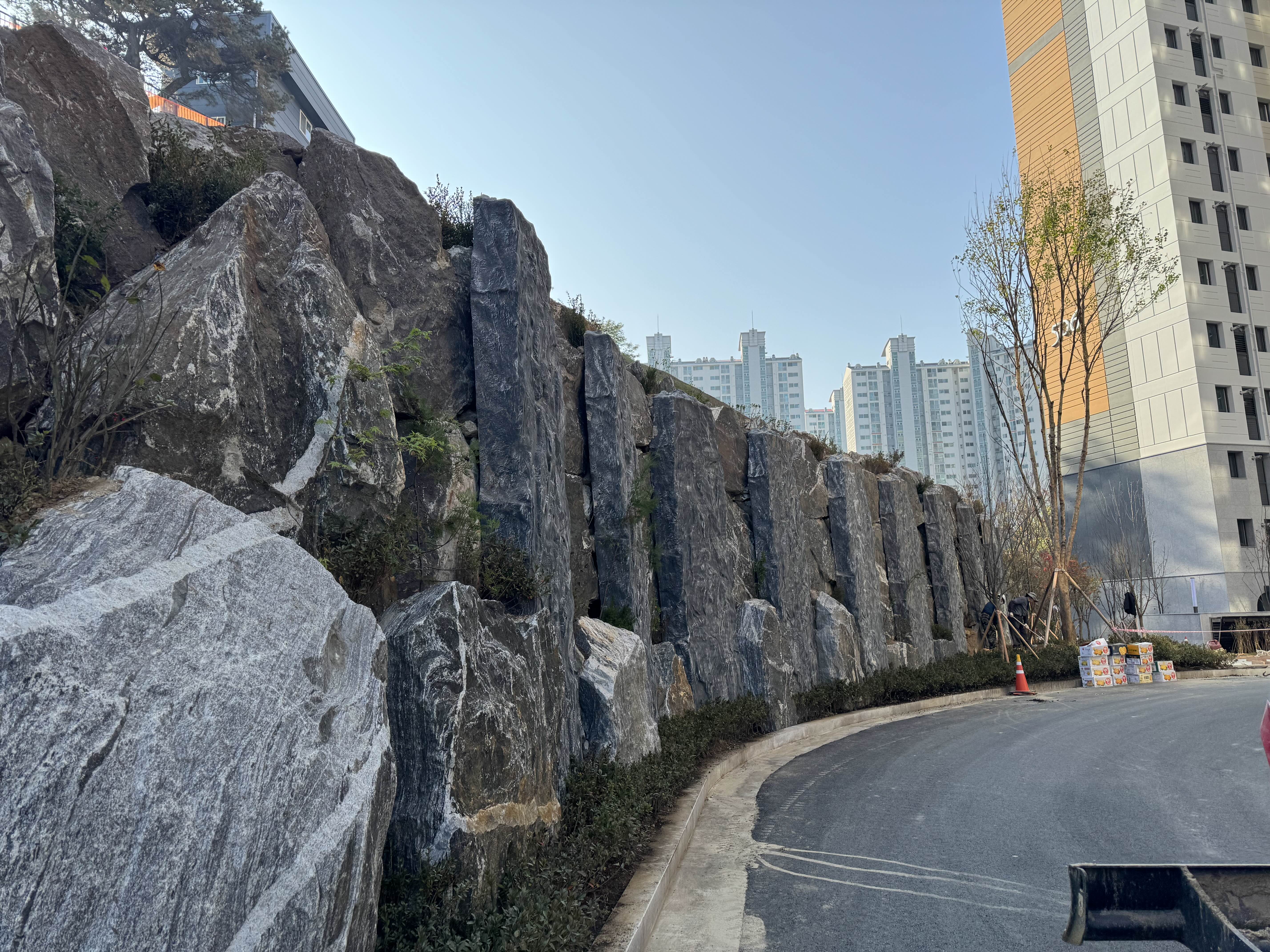 다만 이 산벽은 페이크입니다. 저 커다란 장대석같은 녀석은 조경석 베이스가 아니고 거푸집을 대고 콘크리트를 부어 만든 산벽입니다. 틀을 잘 만들고 색칠까지 잘 하니 구별하기 좀 어려웠습니다만 자세히 보니 틀이 같아 모양도 모두 일정하더라구요. 특허받은 제품이라고 합니다. 나름 괜찮았습니다. 구조적으로도 파일을 박아 문제없다는 것 같습니다.