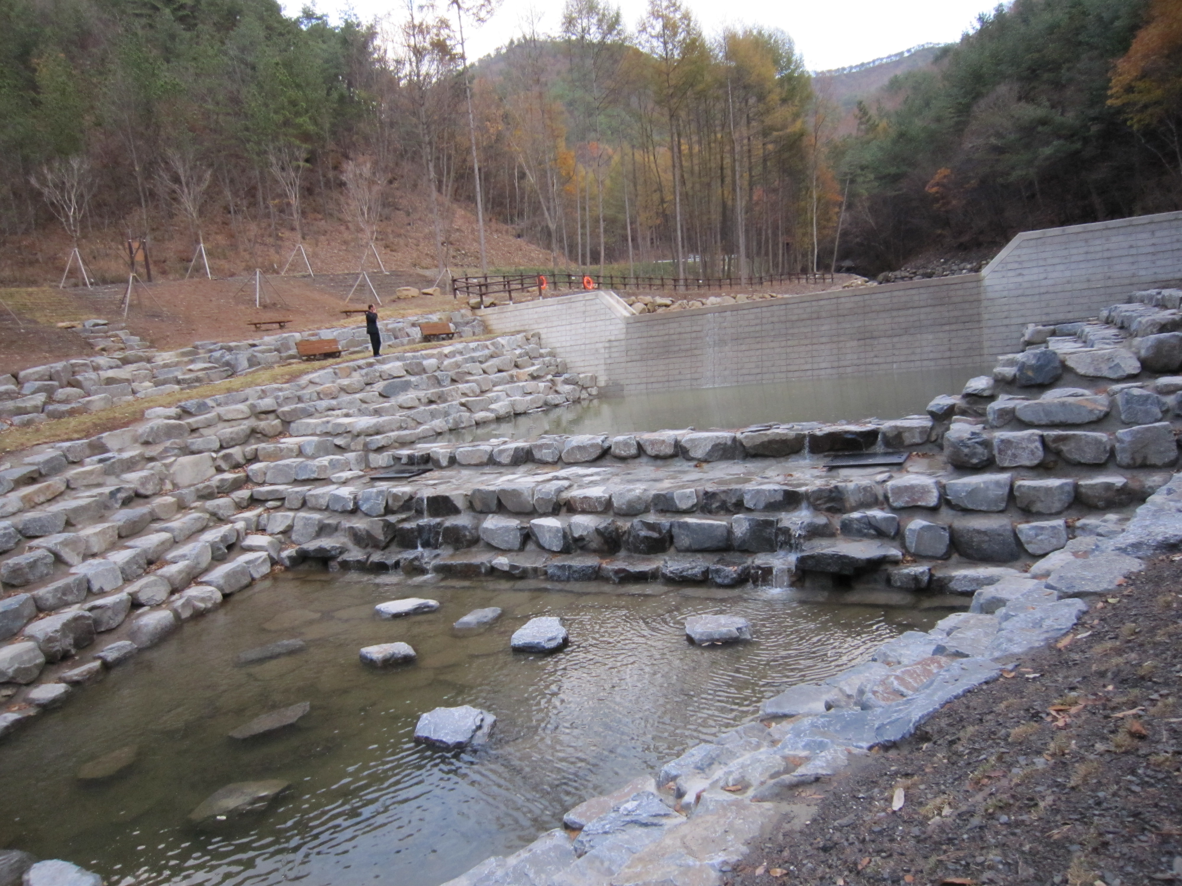 다. 사방댐 설치사업: 계류의 경사도를 완화시켜 침식을 방지하고 상류에서 내려오는 토석ㆍ나무 등과 토석류를 차단하며 수원 함양을 위하여 계류를 횡단하여 소규모 댐을 설치하는 사방사업