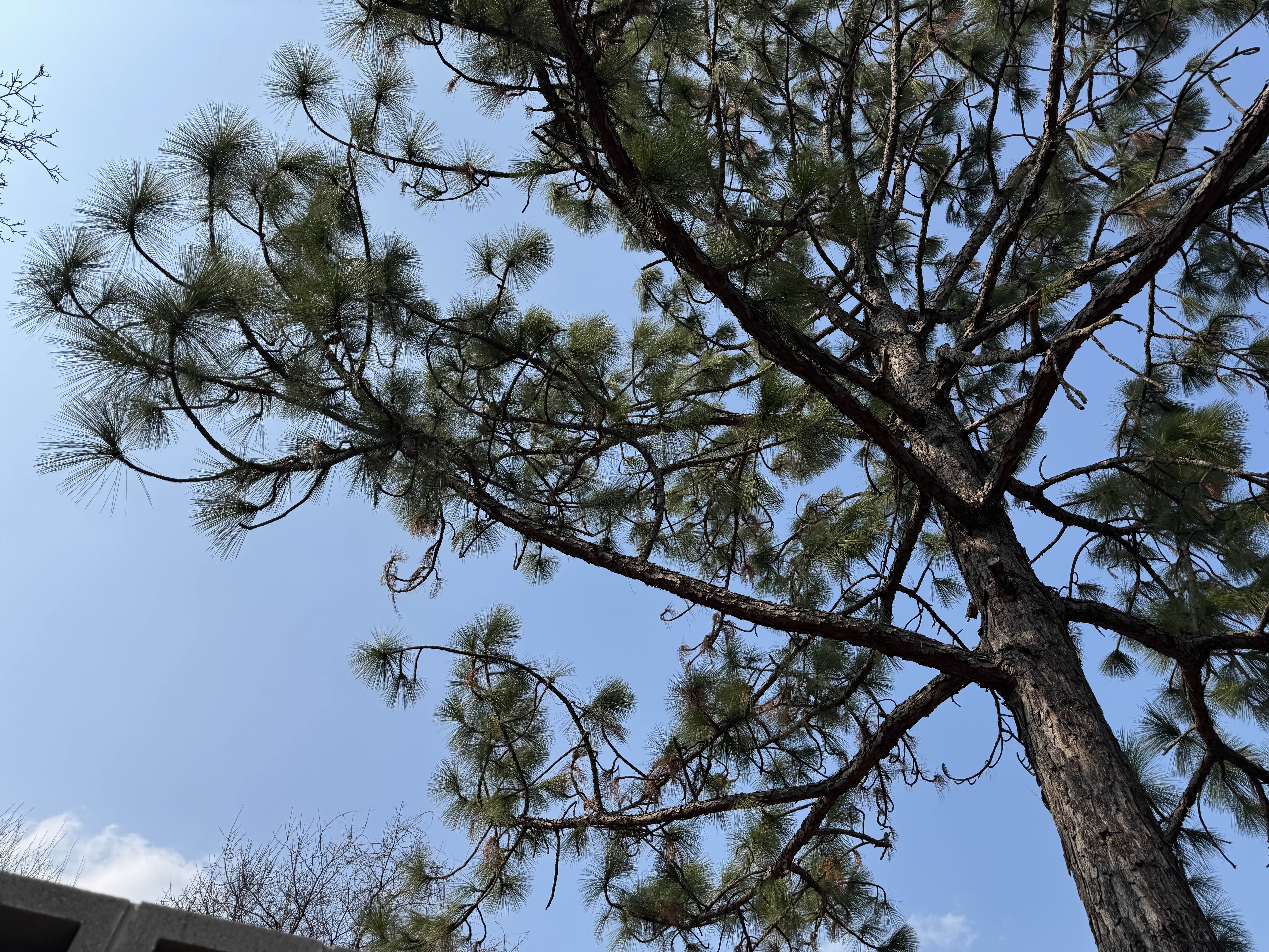 이 나무의 가장 큰 특징은 잎의 크기입니다. 🌿 우리나라에서 흔히 볼 수 있는 소나무보다 잎이 3~4배 정도 더 길고 굵어요. 길어진 잎 때문인지, 전체적으로 조금 축축 늘어지는 느낌도 있었습니다.