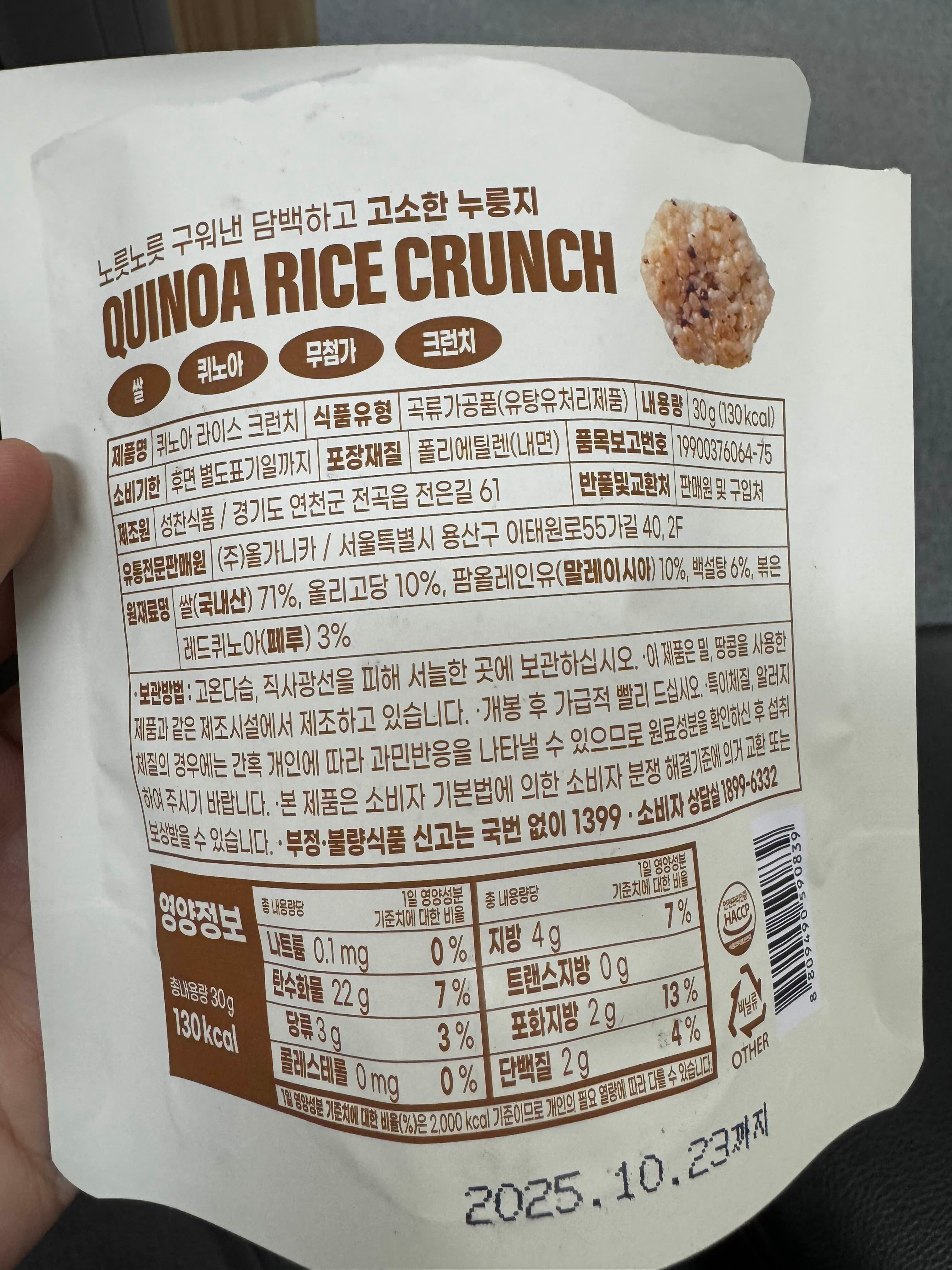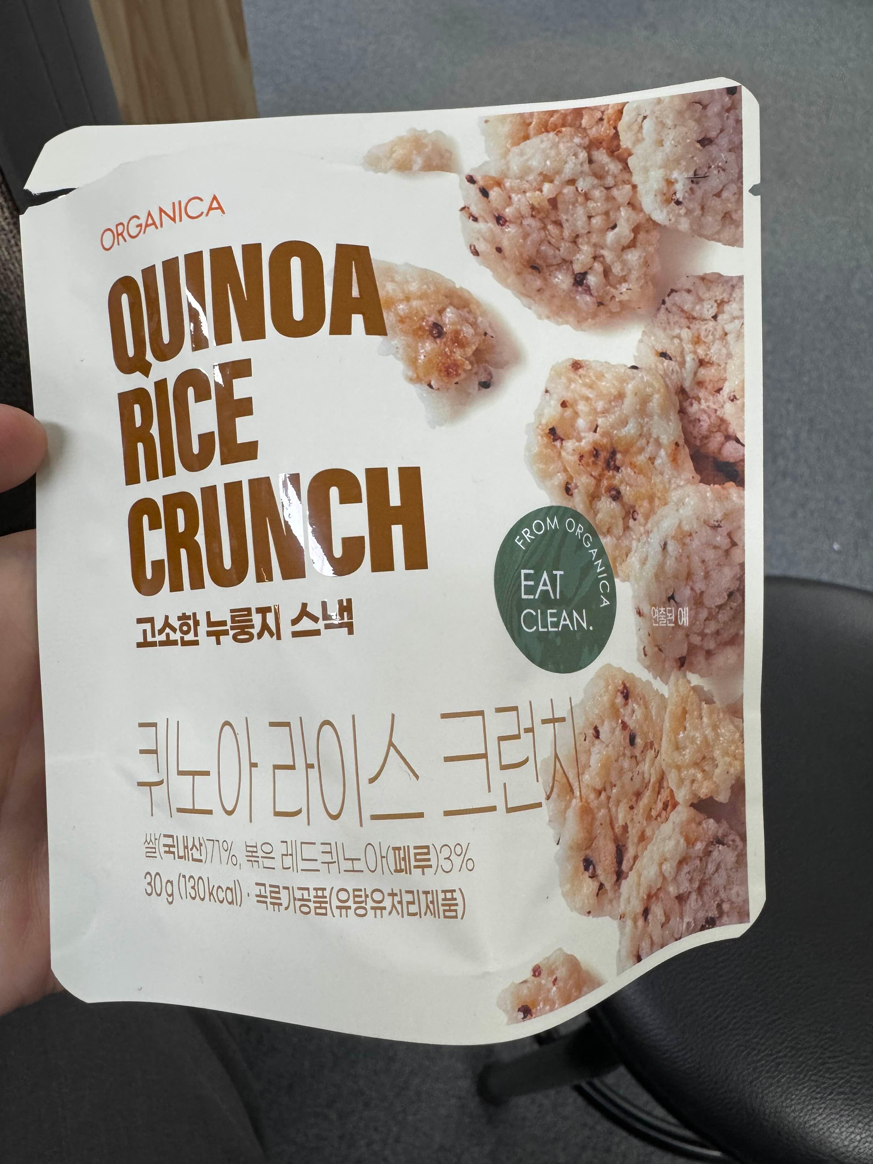 한입 베어 물자마자 "와, 바삭하다!" 라는 감탄이 절로 나왔어요. 바삭하면서도 은은하게 퍼지는 고소한 맛이 너무 좋았어요. 💕 쌀과 퀴노아가 어우러져 과하게 달지 않고 담백하면서도 감칠맛 나는 고소함이 느껴졌어요.