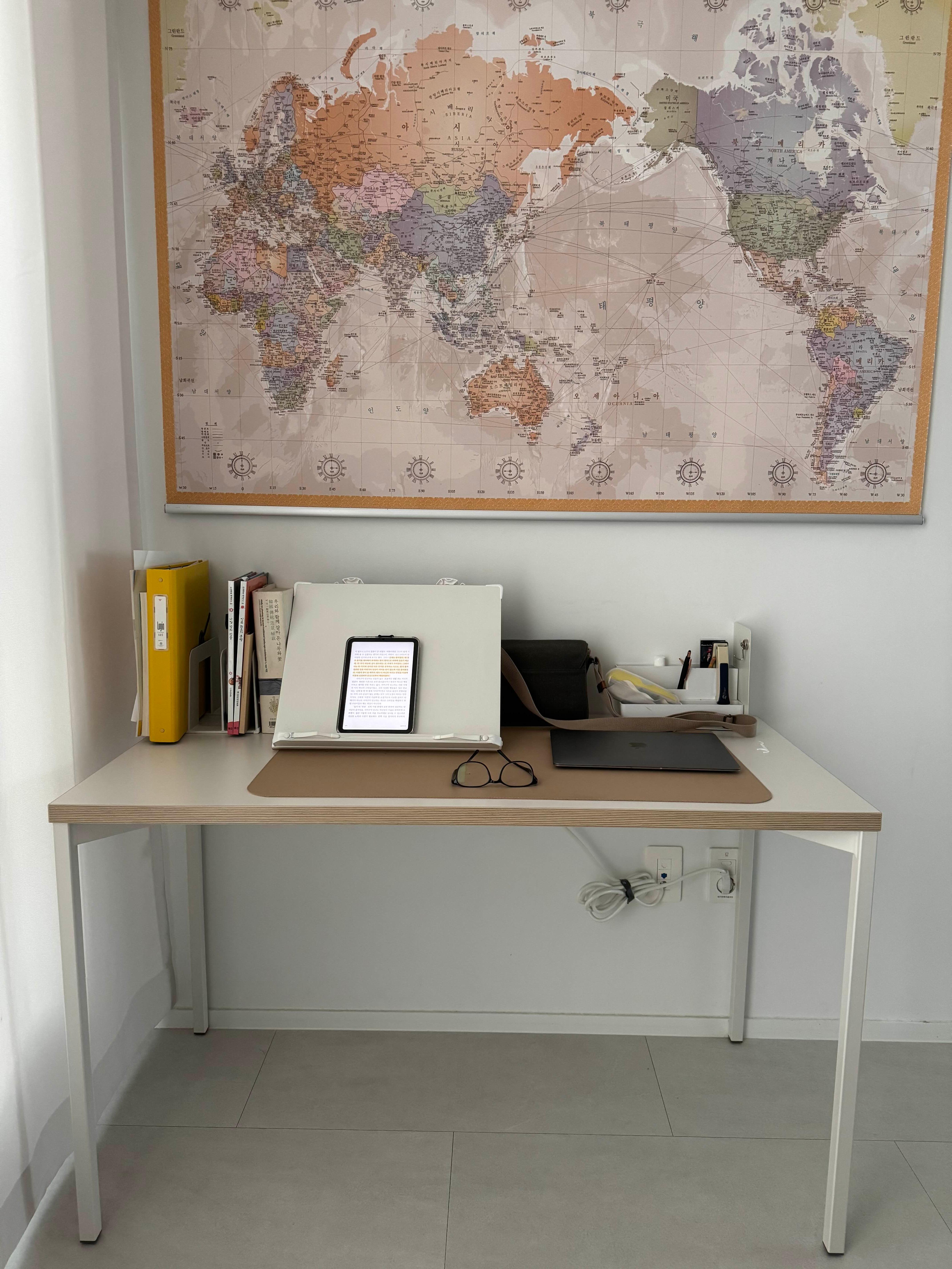 책상은 세계지도 배경으로 꾸며져 있어 여행하는 기분을 느낄 수 있습니다. 여기에 북스탠드와 아이패드 미니를 활용해 전자책을 읽고, 간단한 책 몇 권을 꽂을 수 있는 미니 책장을 배치했어요. 책상 위는 넓은 장패드로 마무리해 깔끔하게 정리했습니다. 🏞️📖