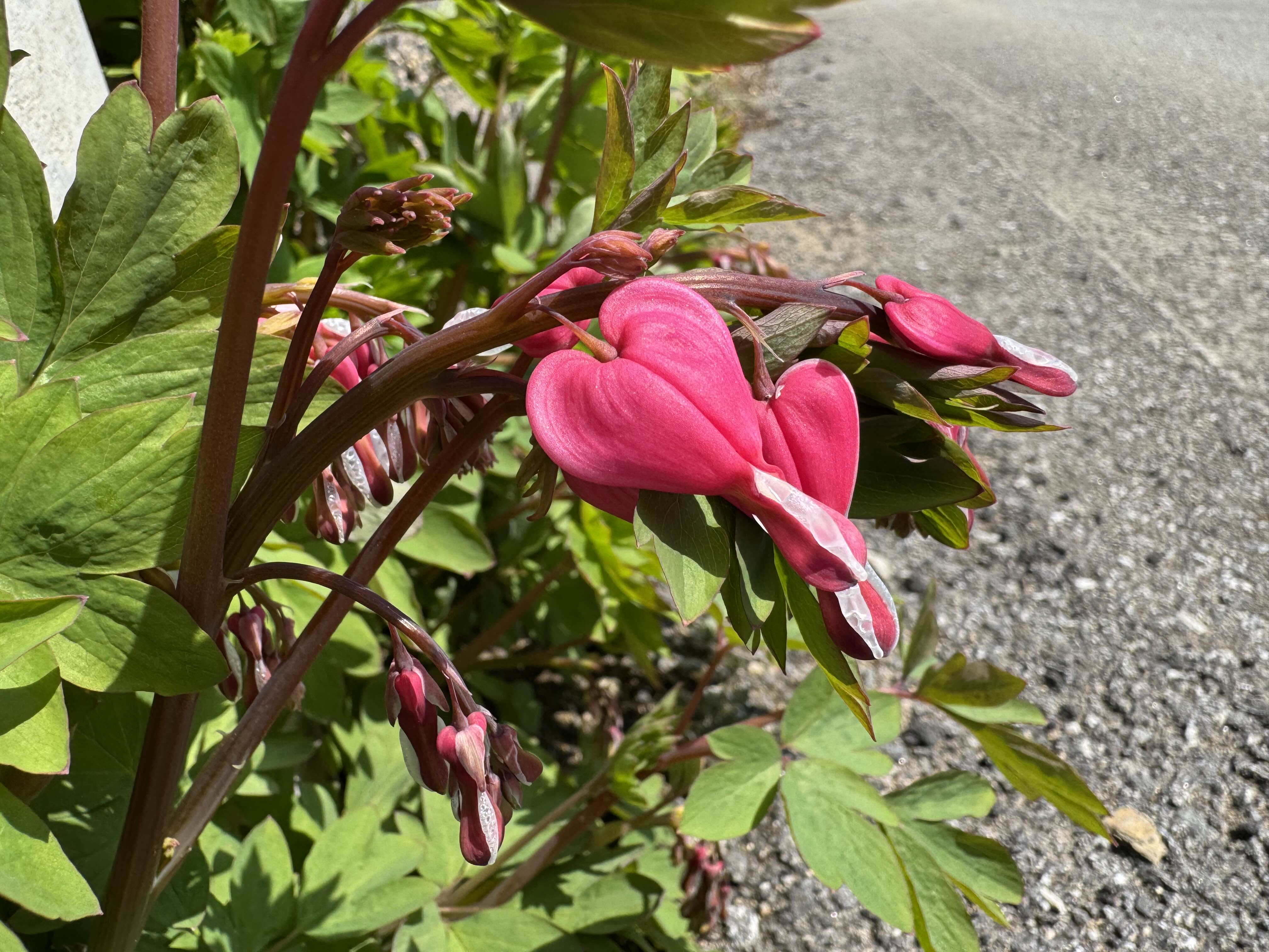 줄기 아래로 줄줄이 매달린 하트 모양의 꽃송이, 색은 연분홍에서 진한 자주까지 다양하고,