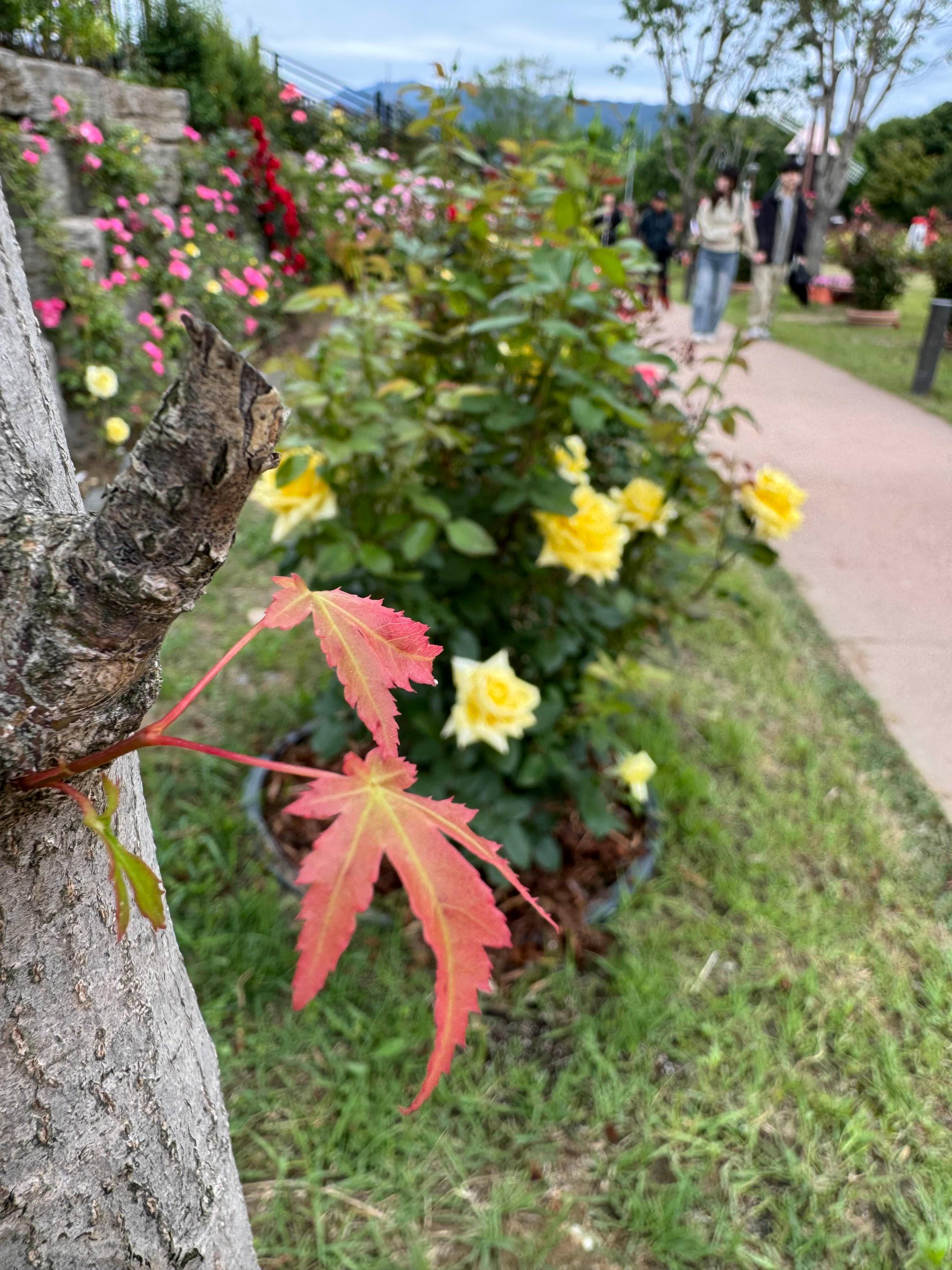 단풍나무 뒤로 산책길과 노오란 장미