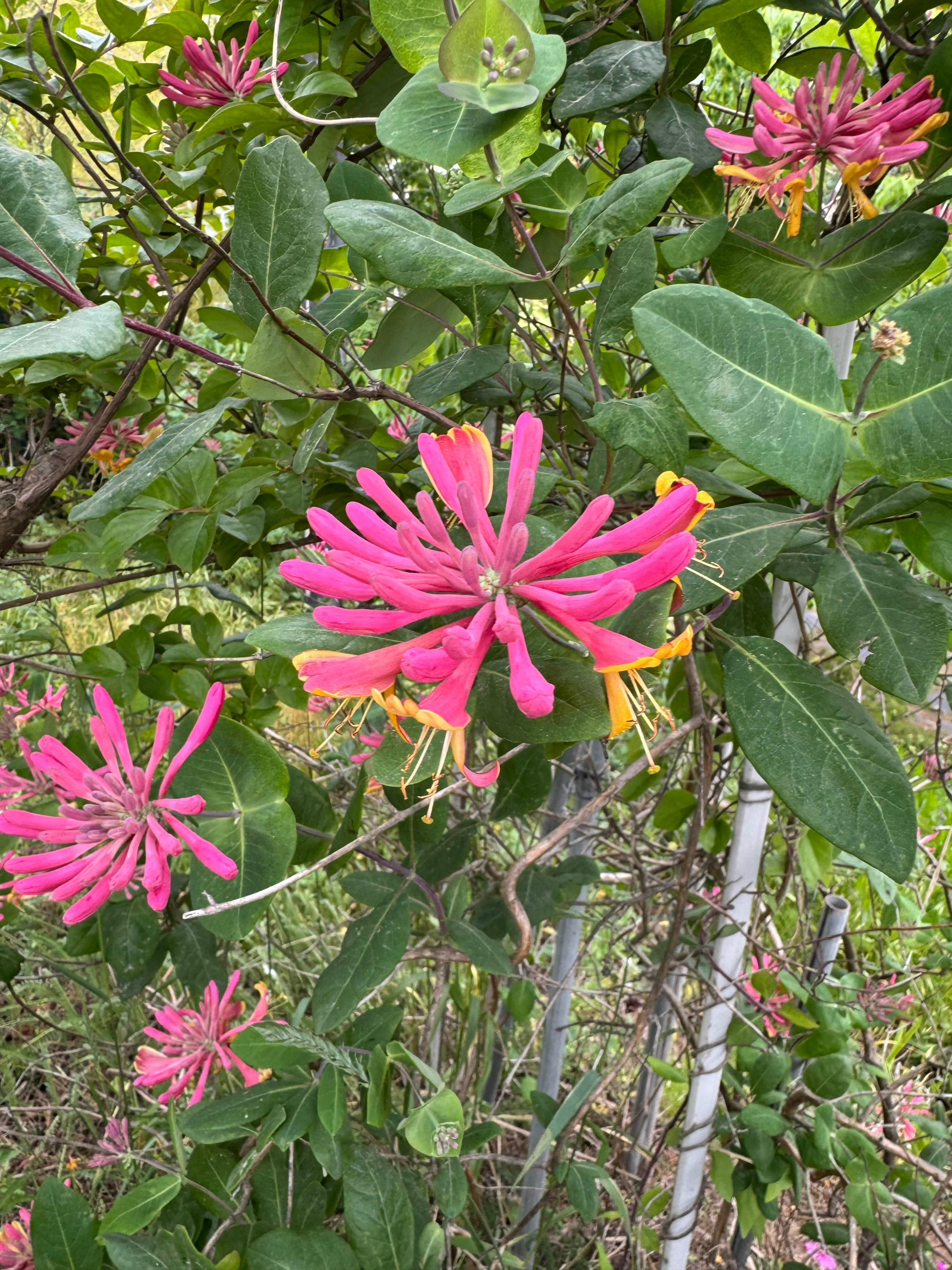 **붉은 인동(Lonicera × heckrottii)**은 꽃과 잎의 색채 대비가 돋보이는 덩굴식물입니다.