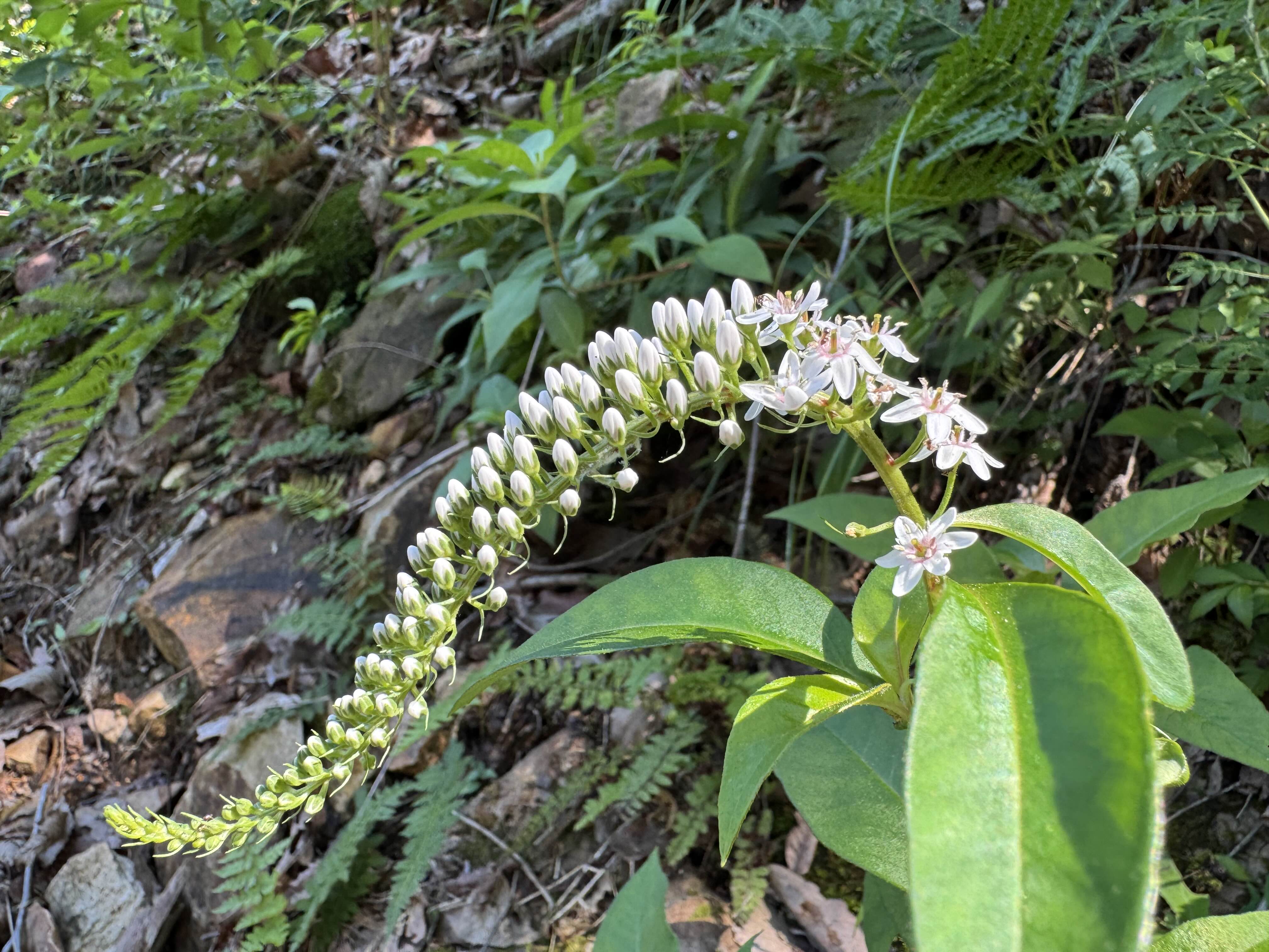 | 특징 | 아치형으로 아래로 휘어진 흰 꽃차례, 넓은 타원형 잎, 매끈한 붉은 줄기 |
