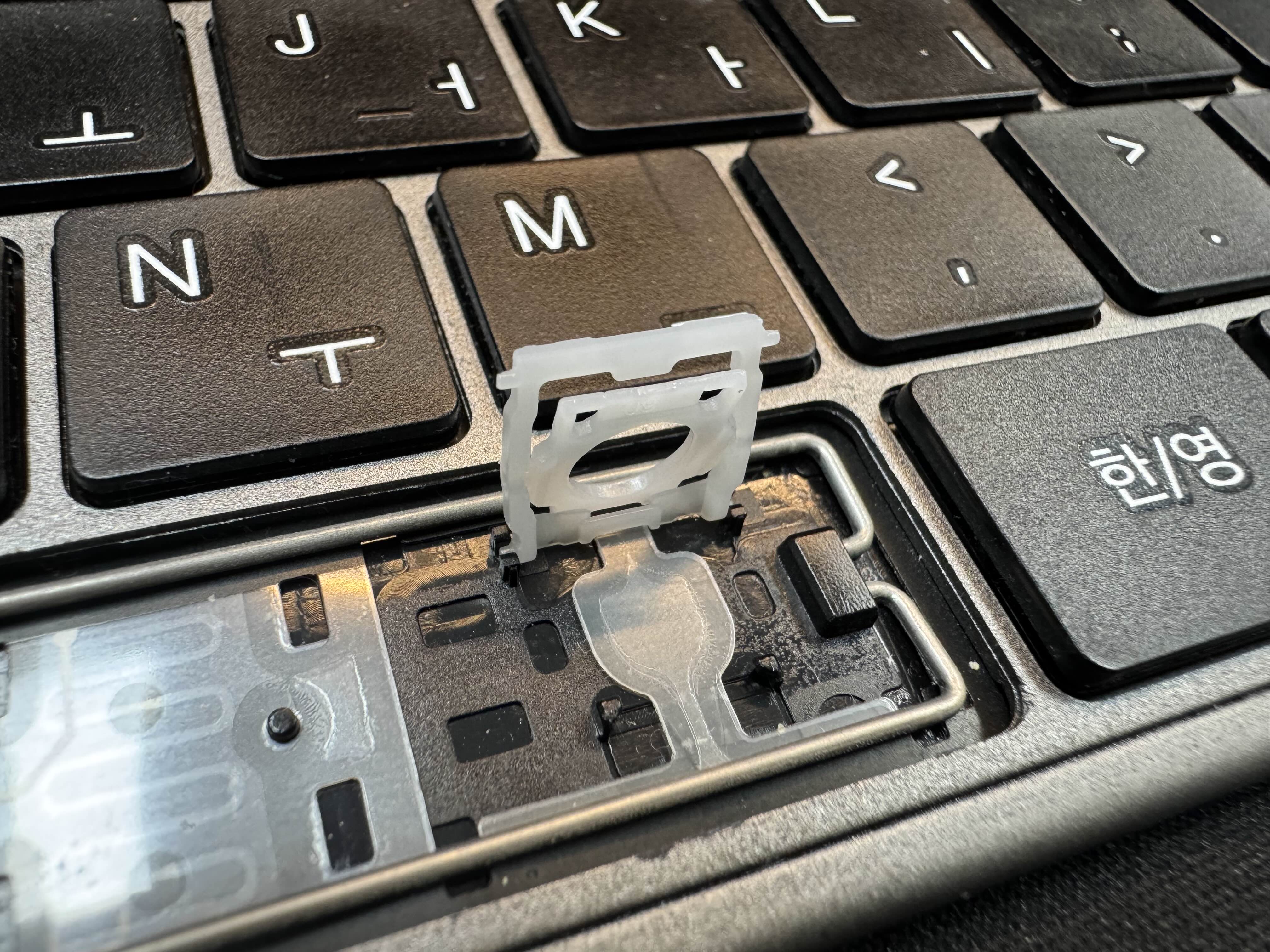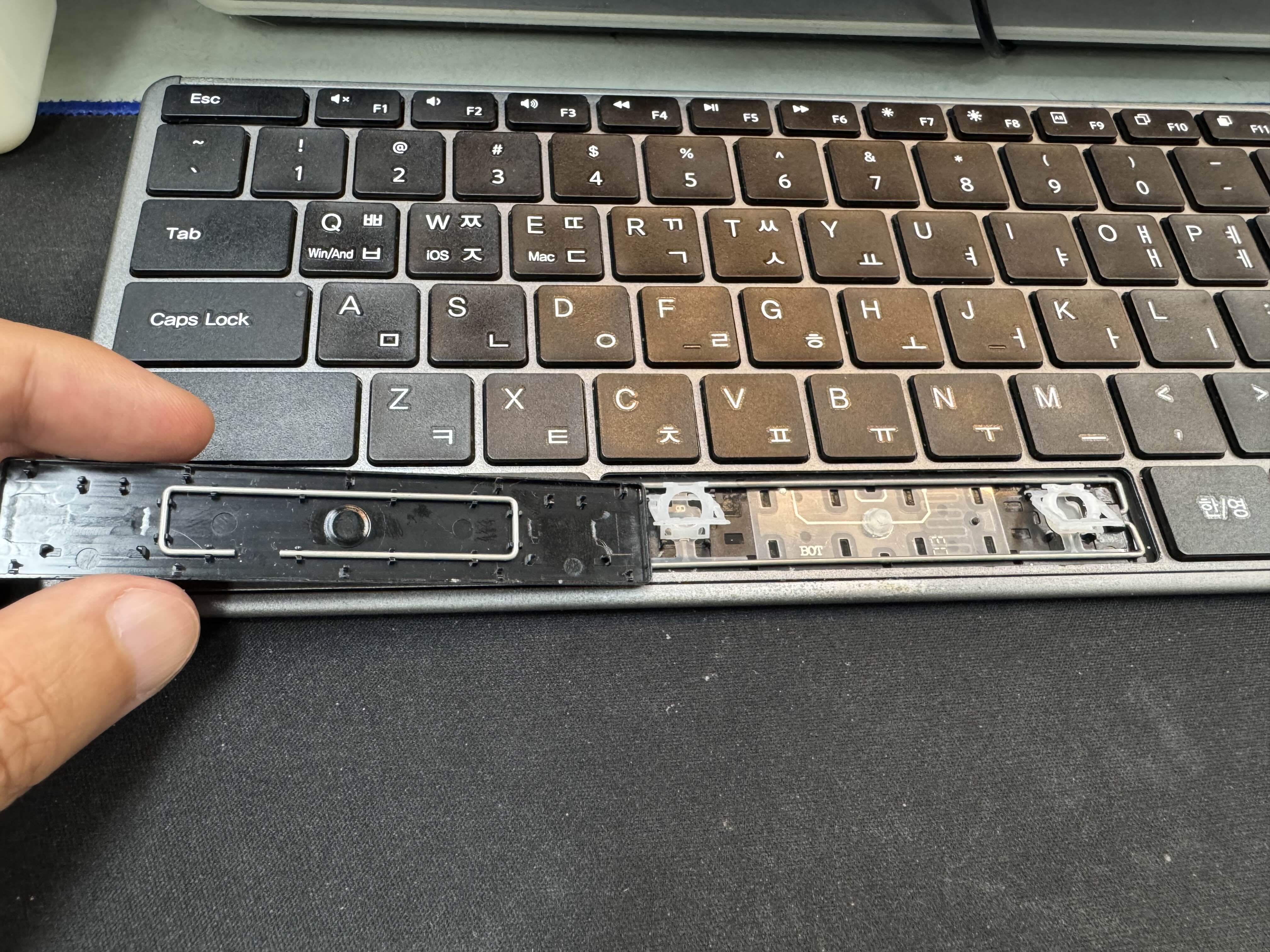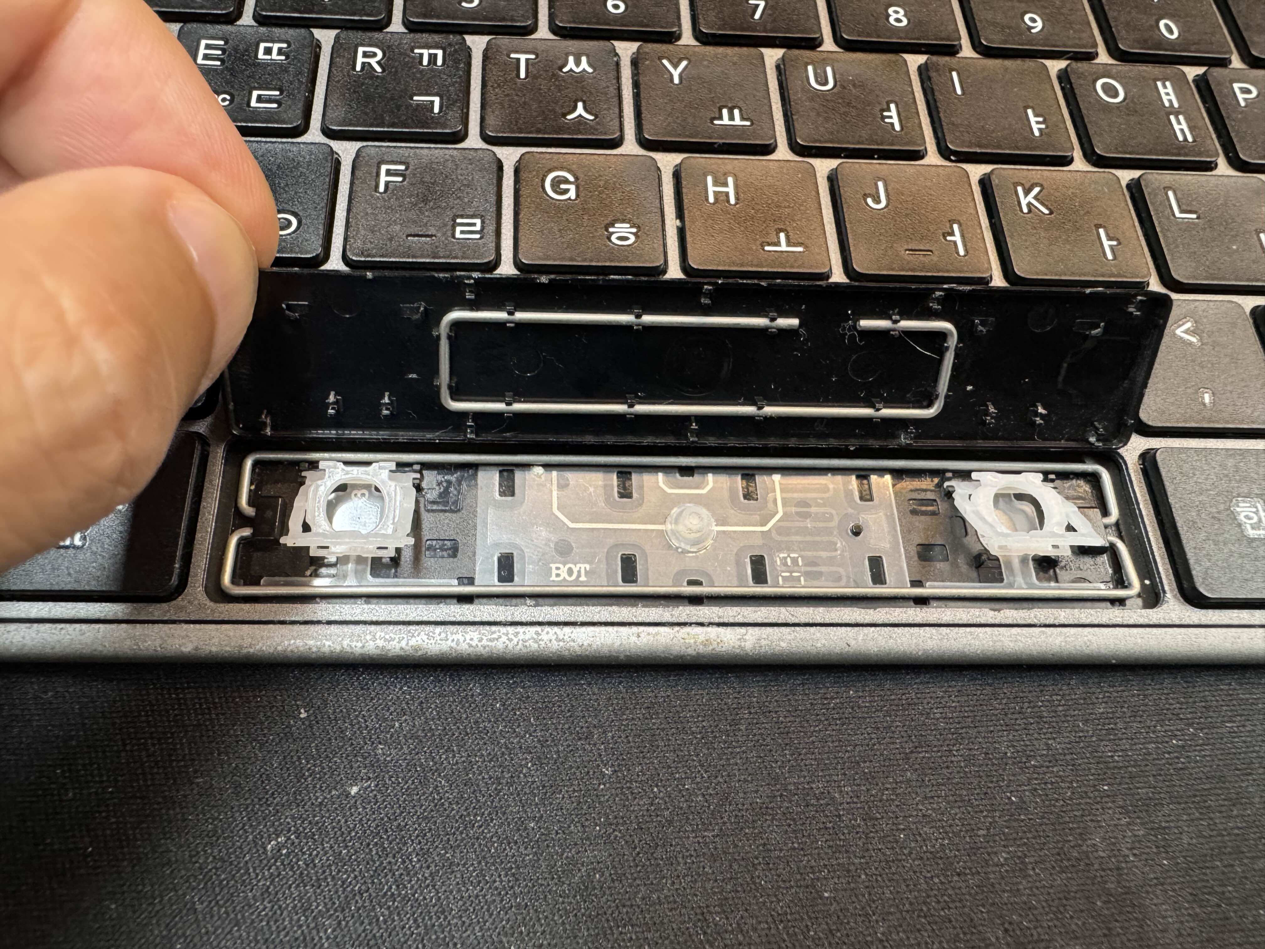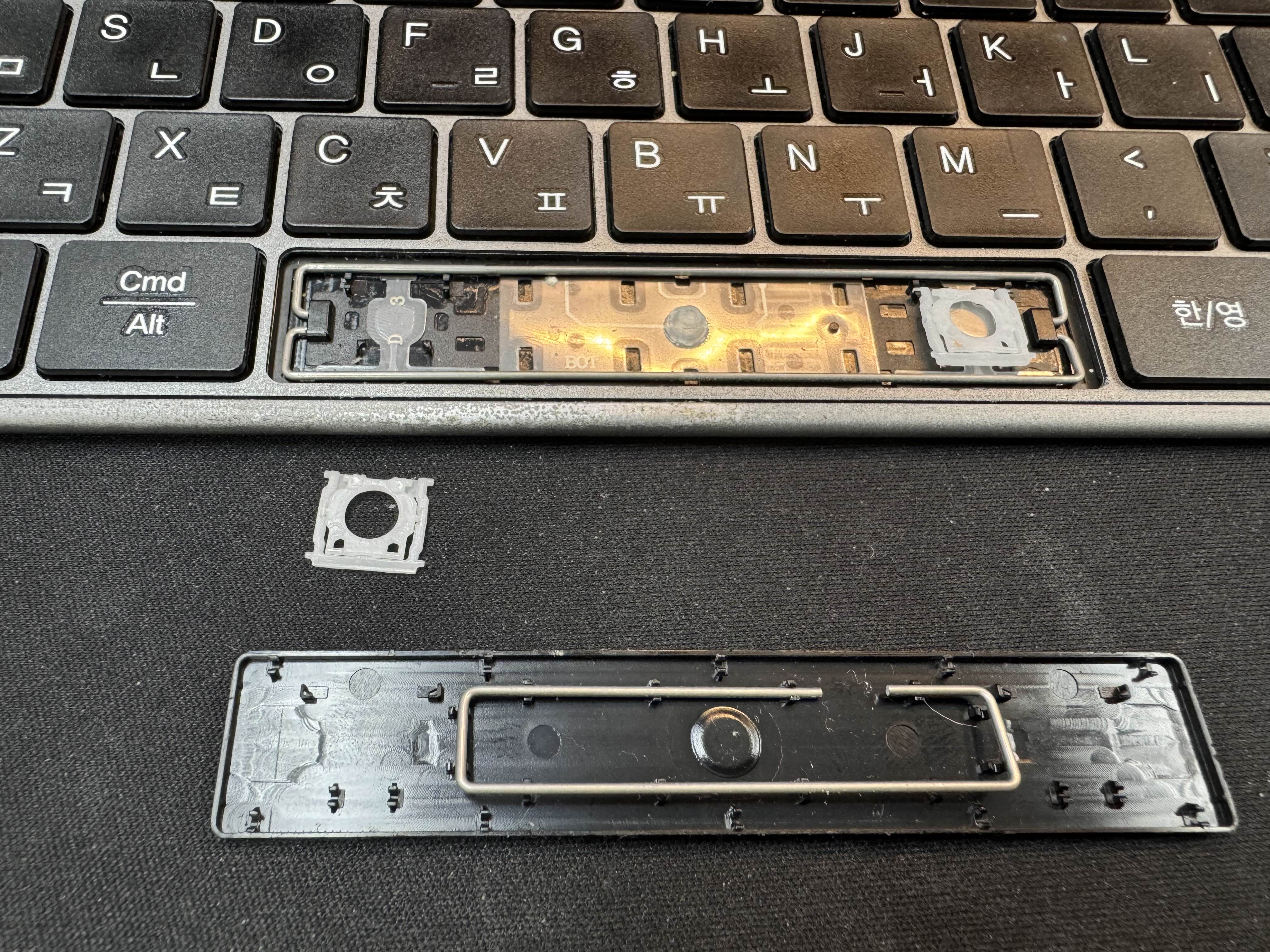 스페이스 바가 잘 안눌려서 뜯어봤는데 펜타그래프 키보드 특유의 얇은 구조때문에 압력도 높고 결국 조립을 다시 못해서 사망선고를 했습니다.