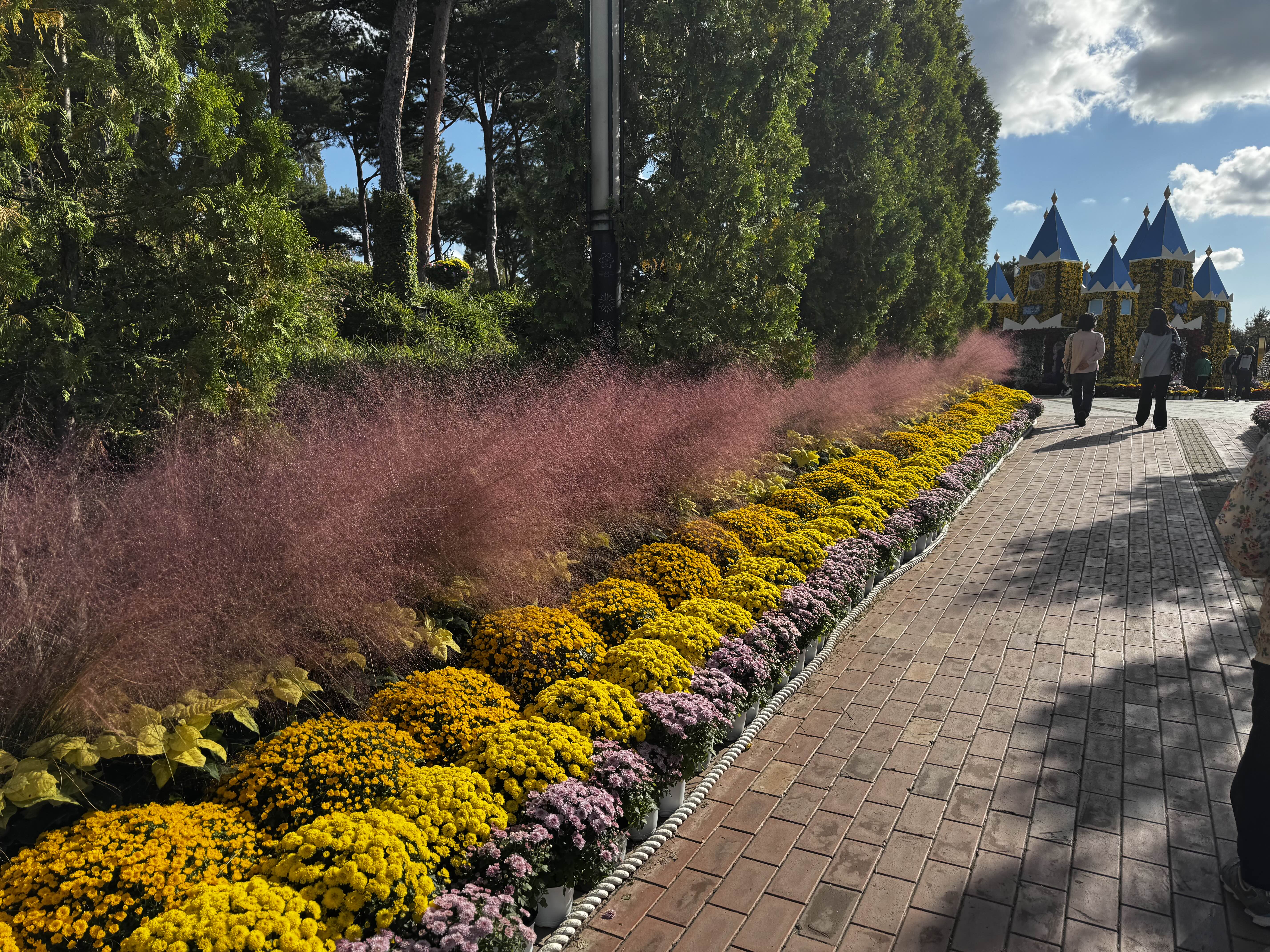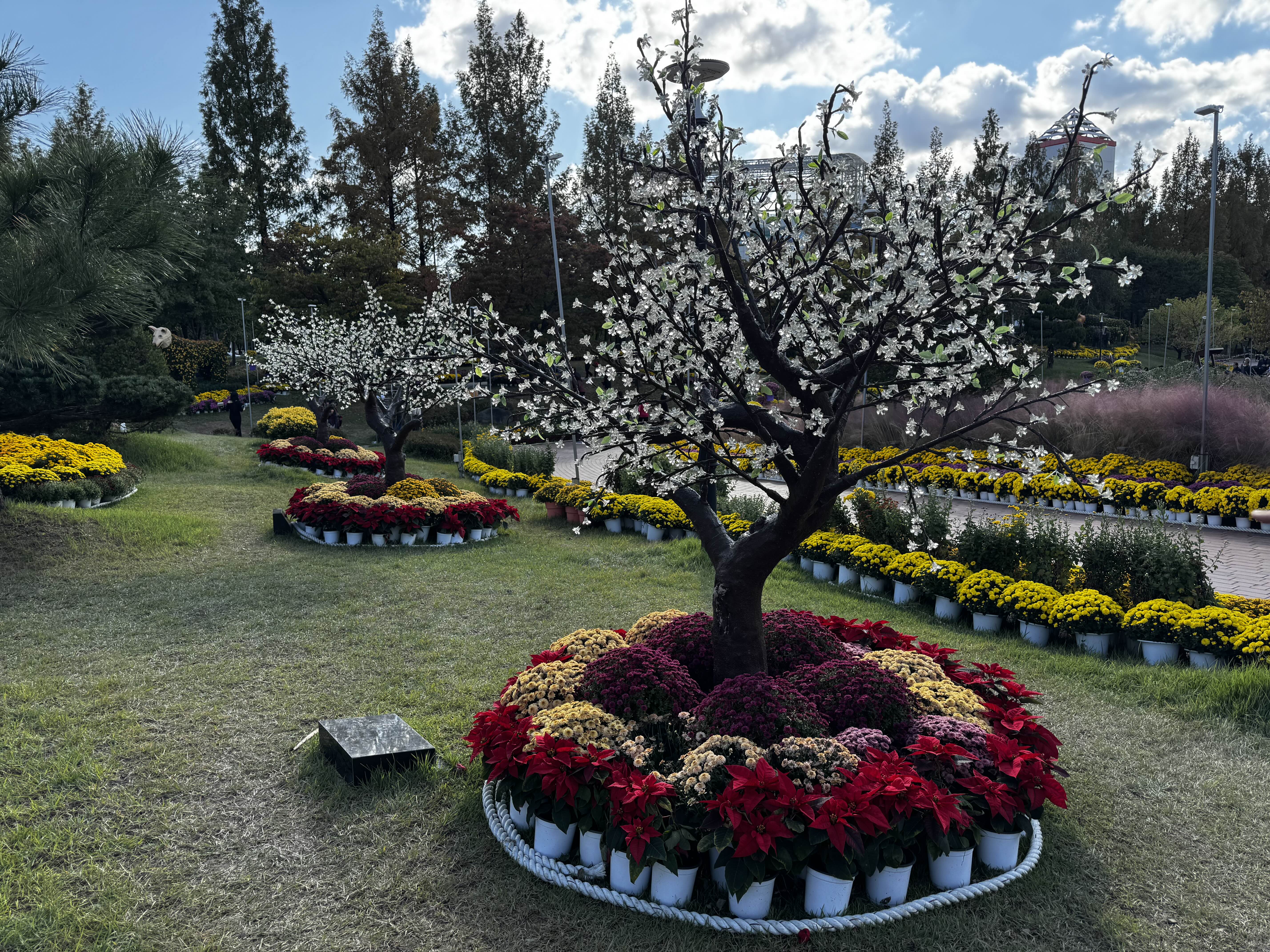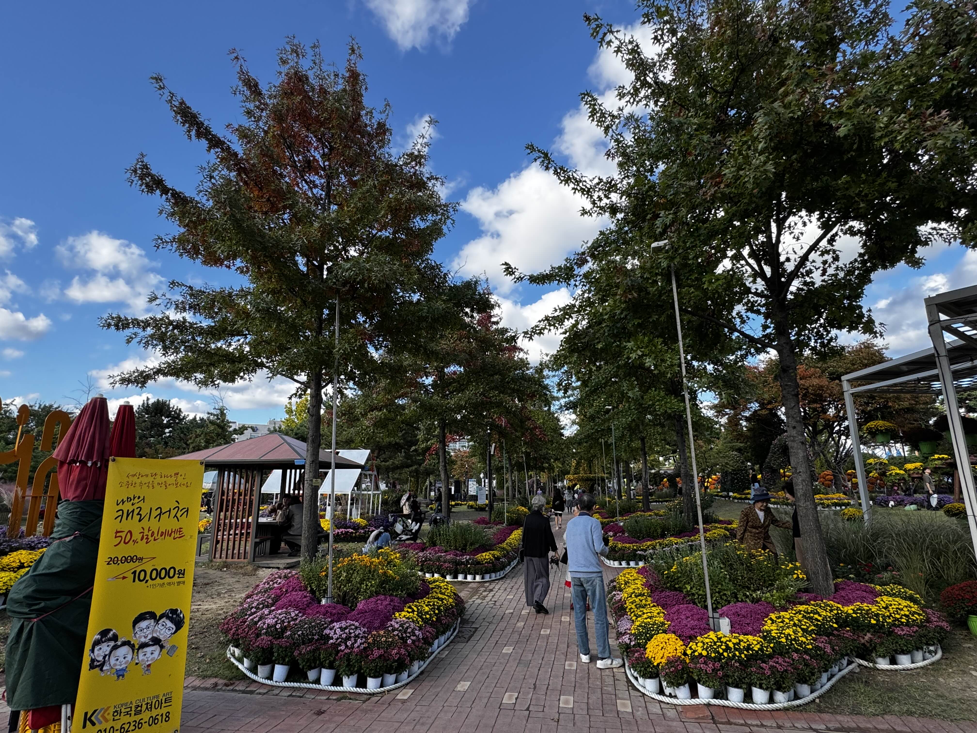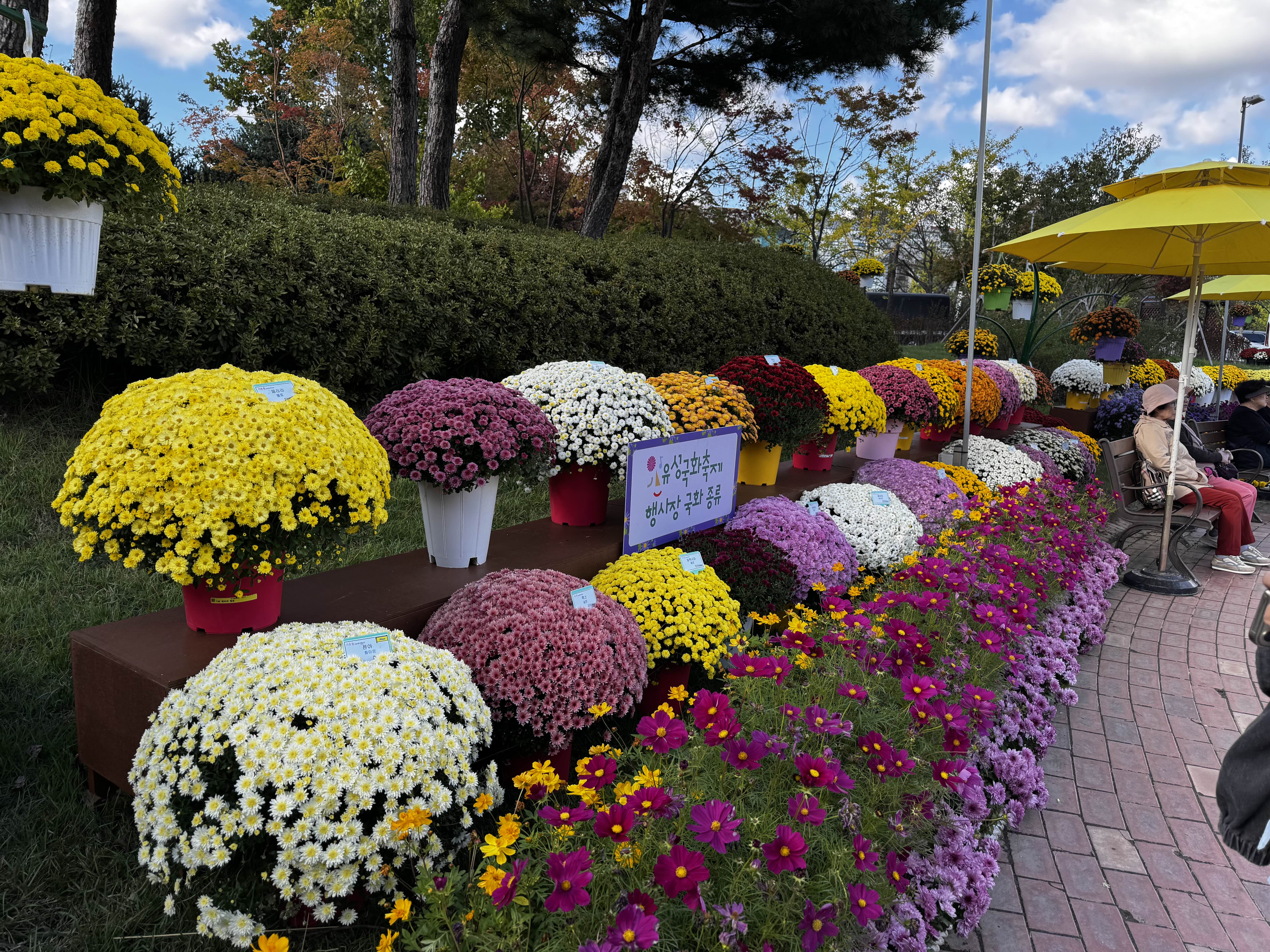 유림공원 입구는 소국이 종류별로 화분이 놓여져 있고 핑크뮬리가 뒷배경이 되었습니다.