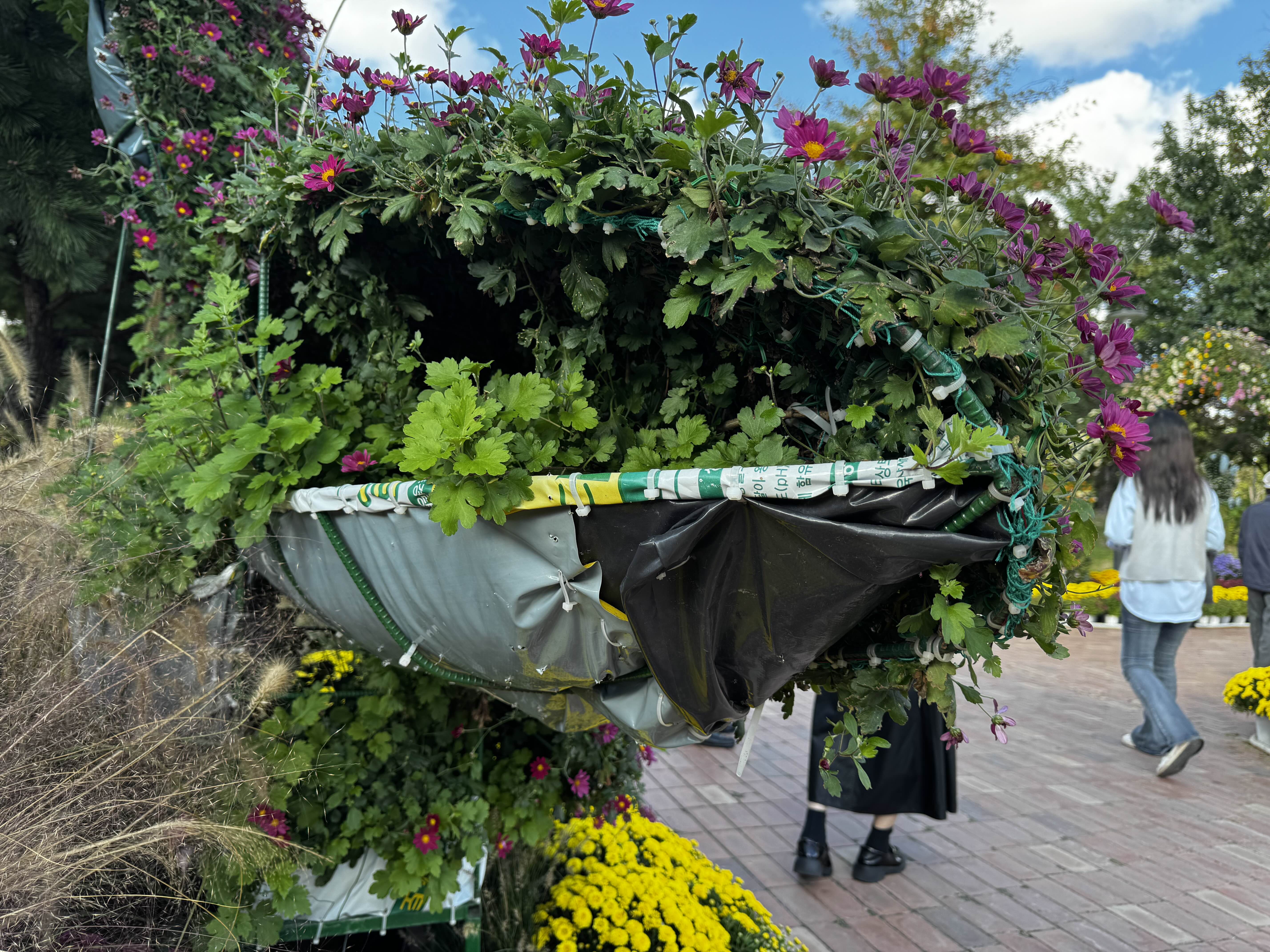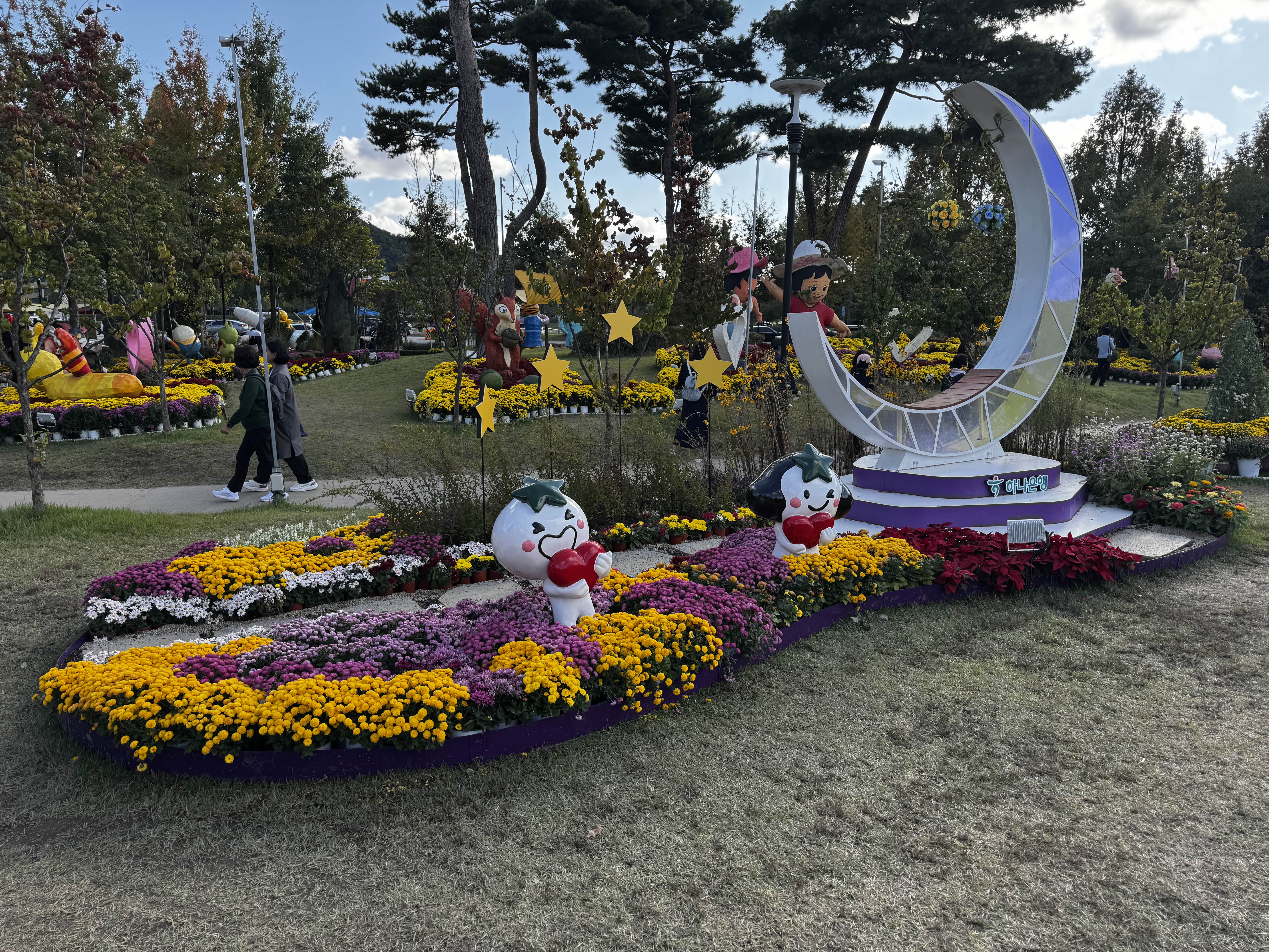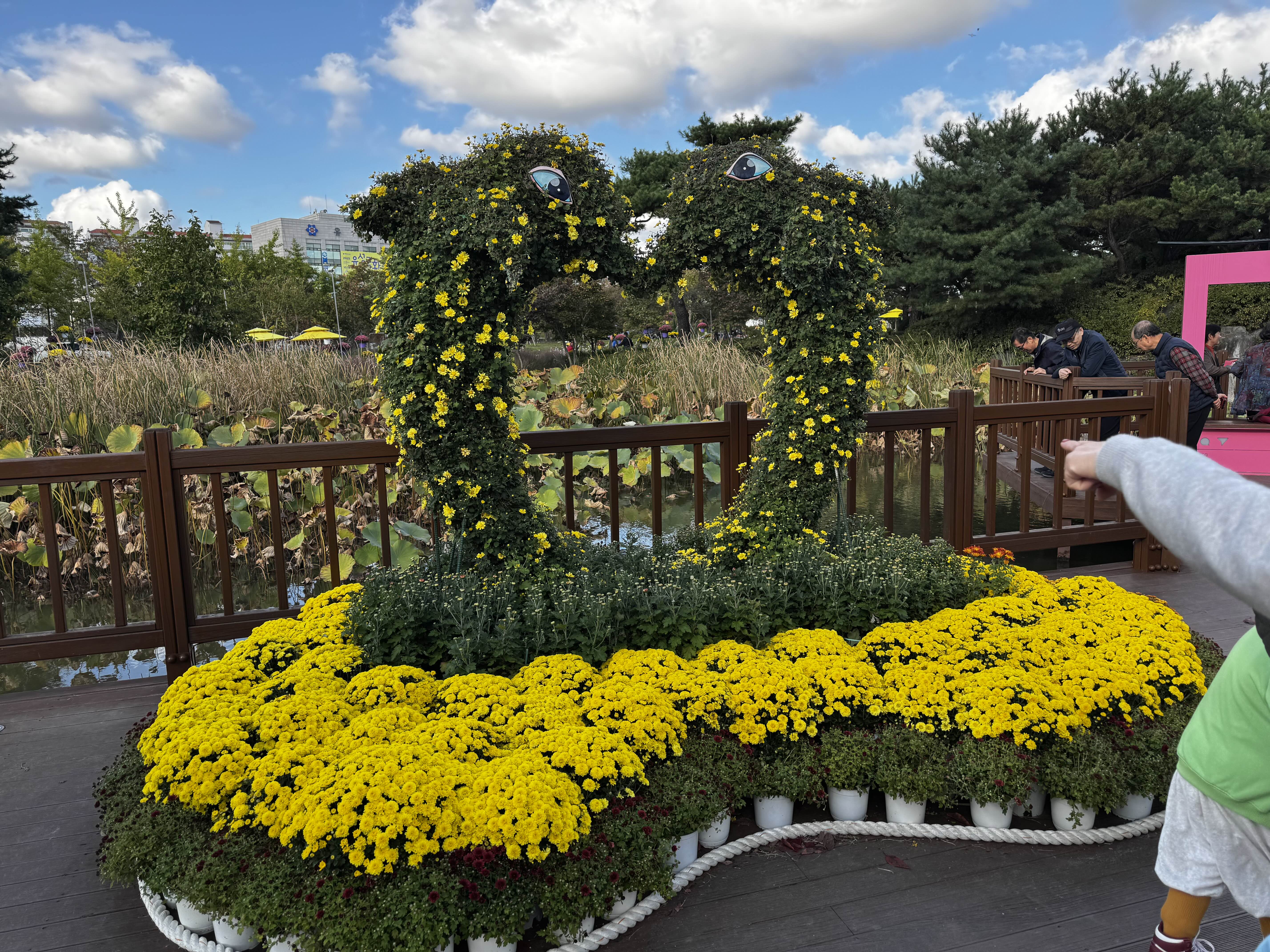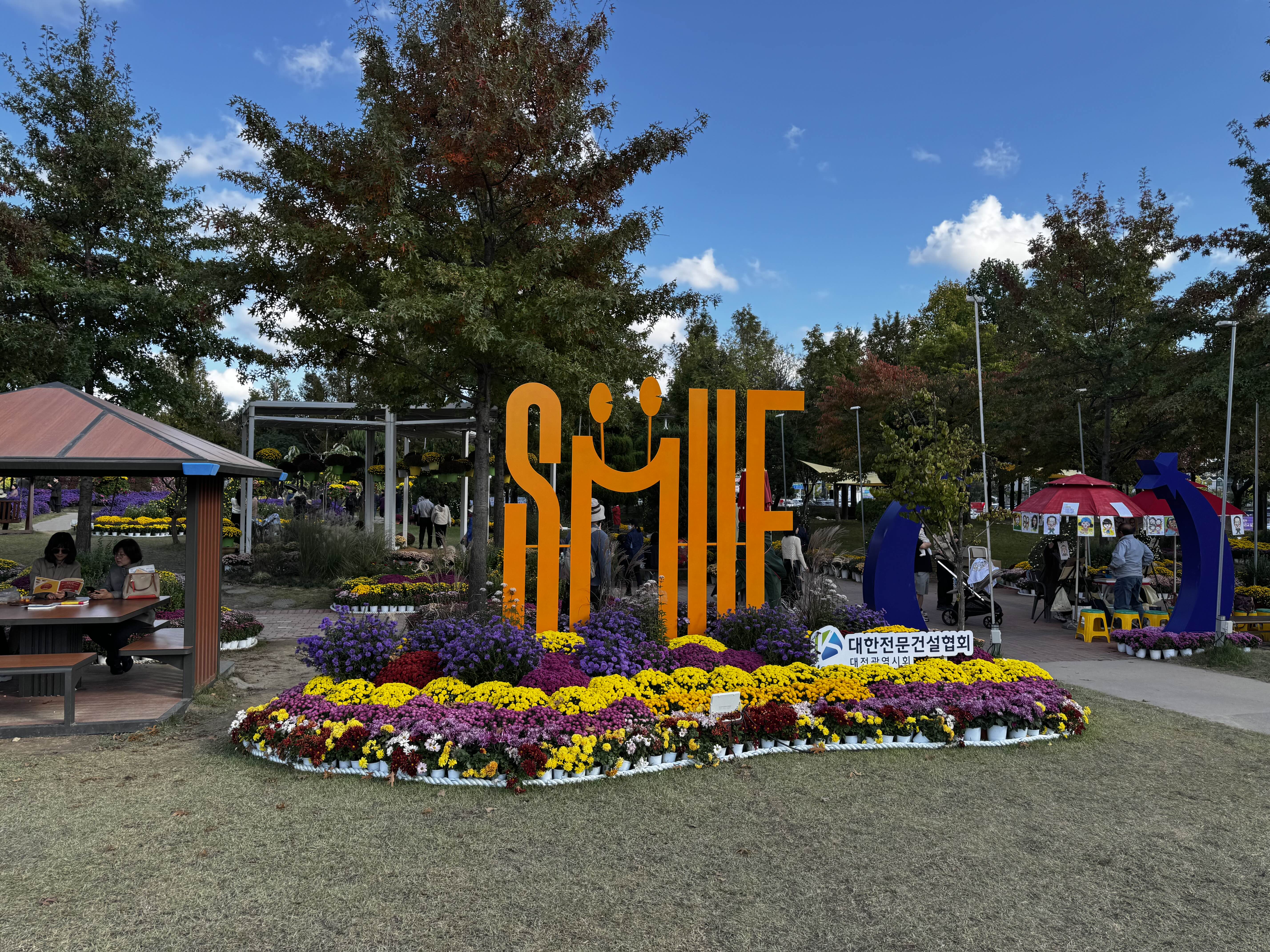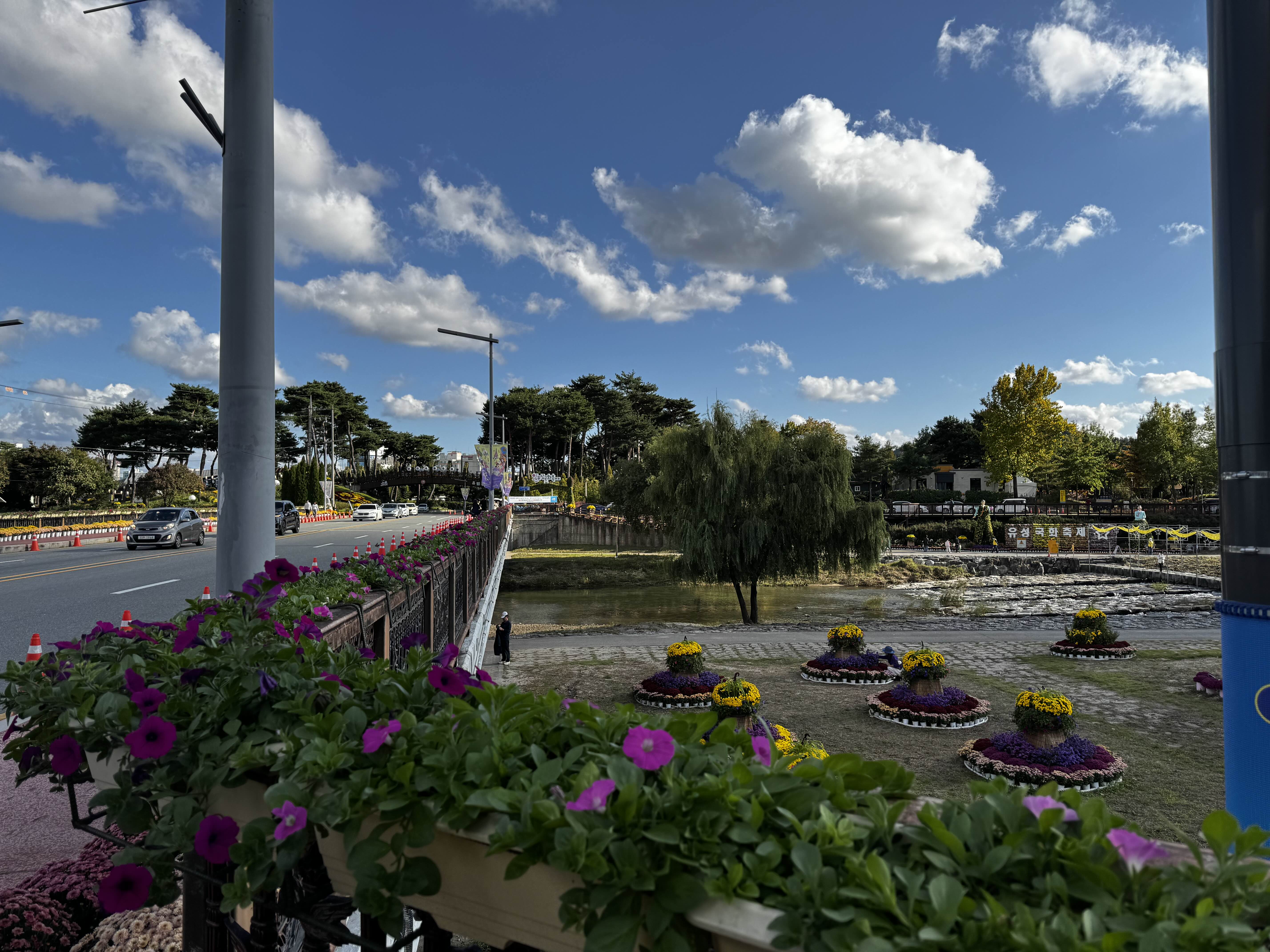 유림공원 입구는 소국이 종류별로 화분이 놓여져 있고 핑크뮬리가 뒷배경이 되었습니다.