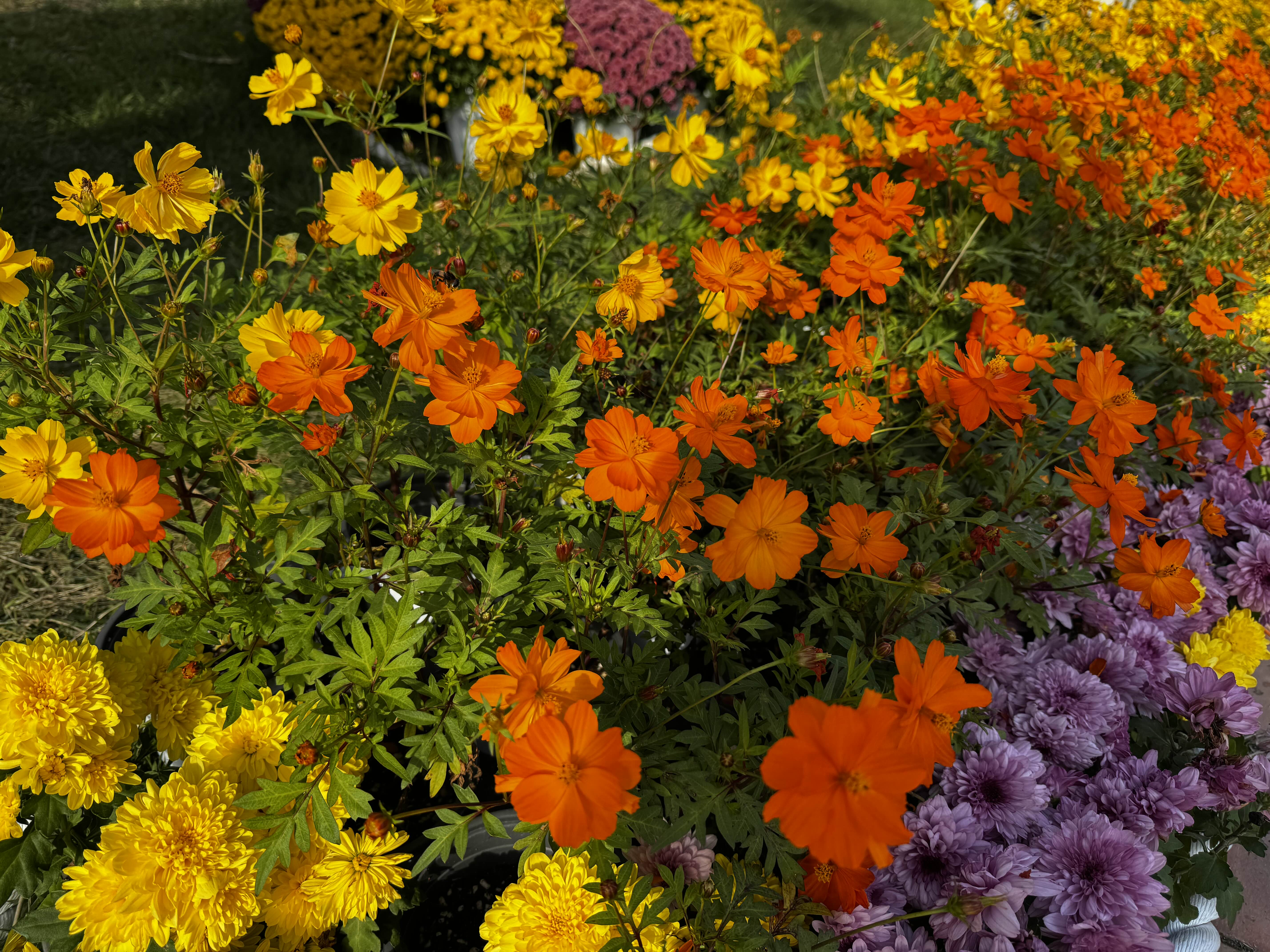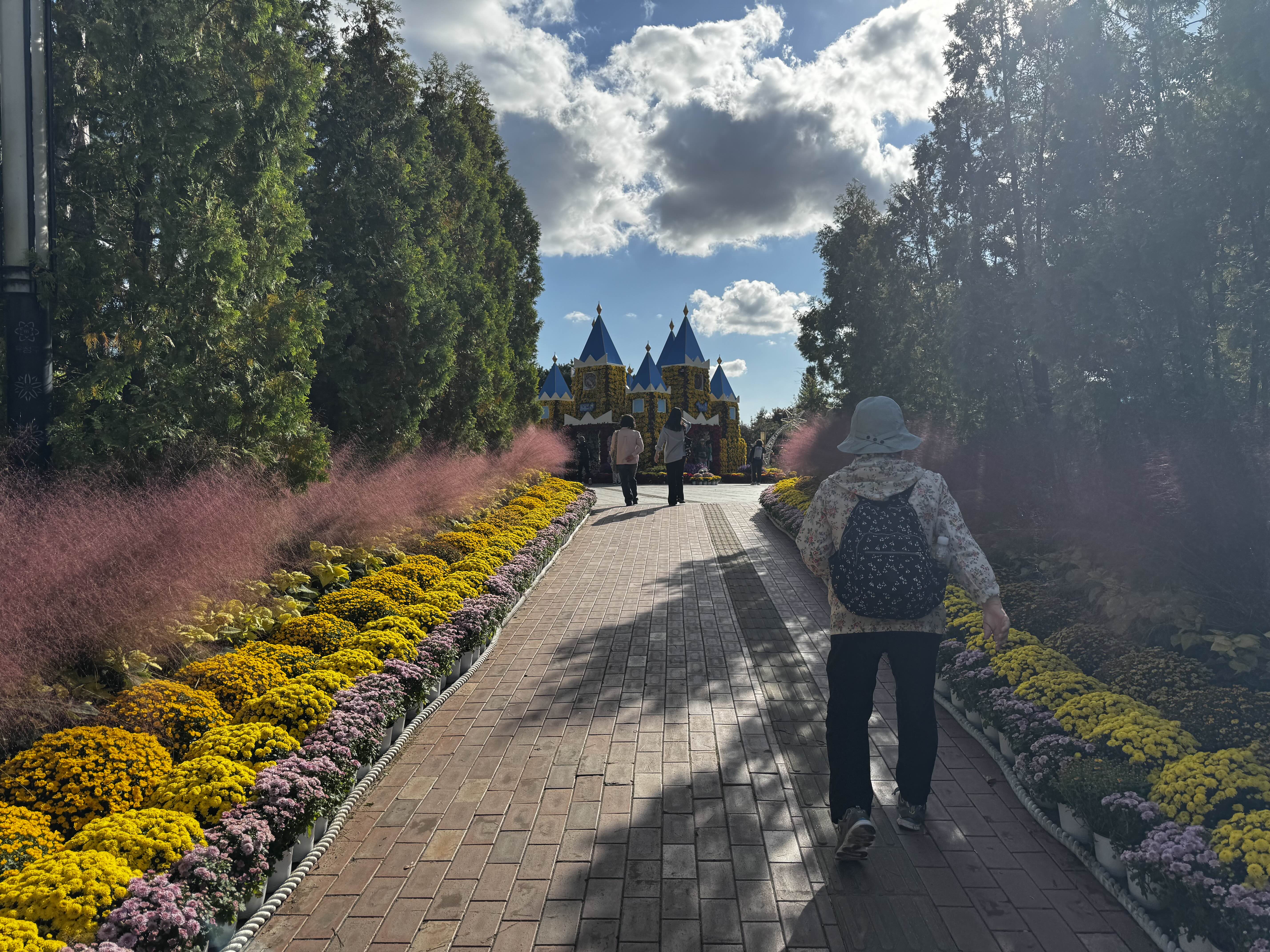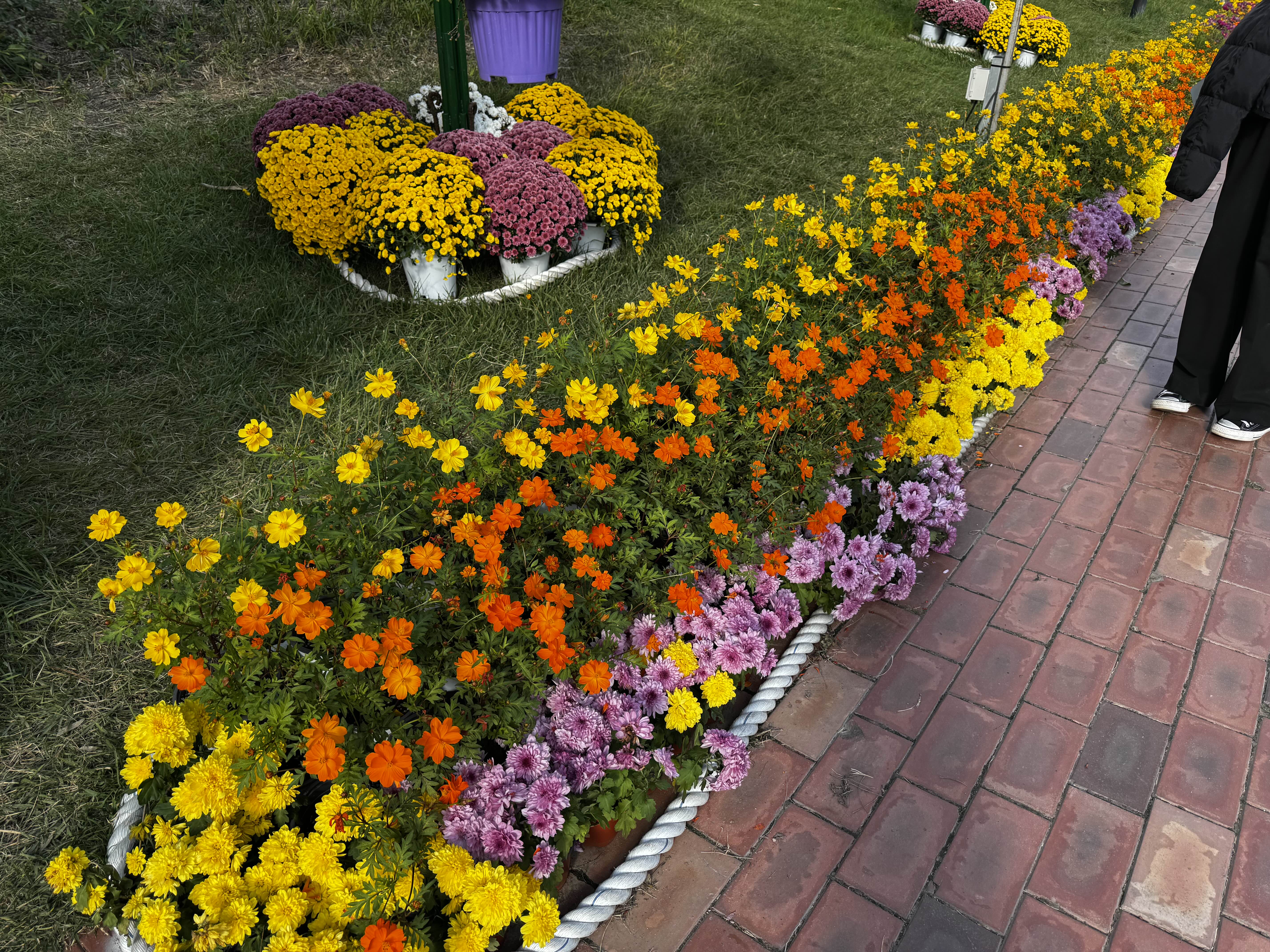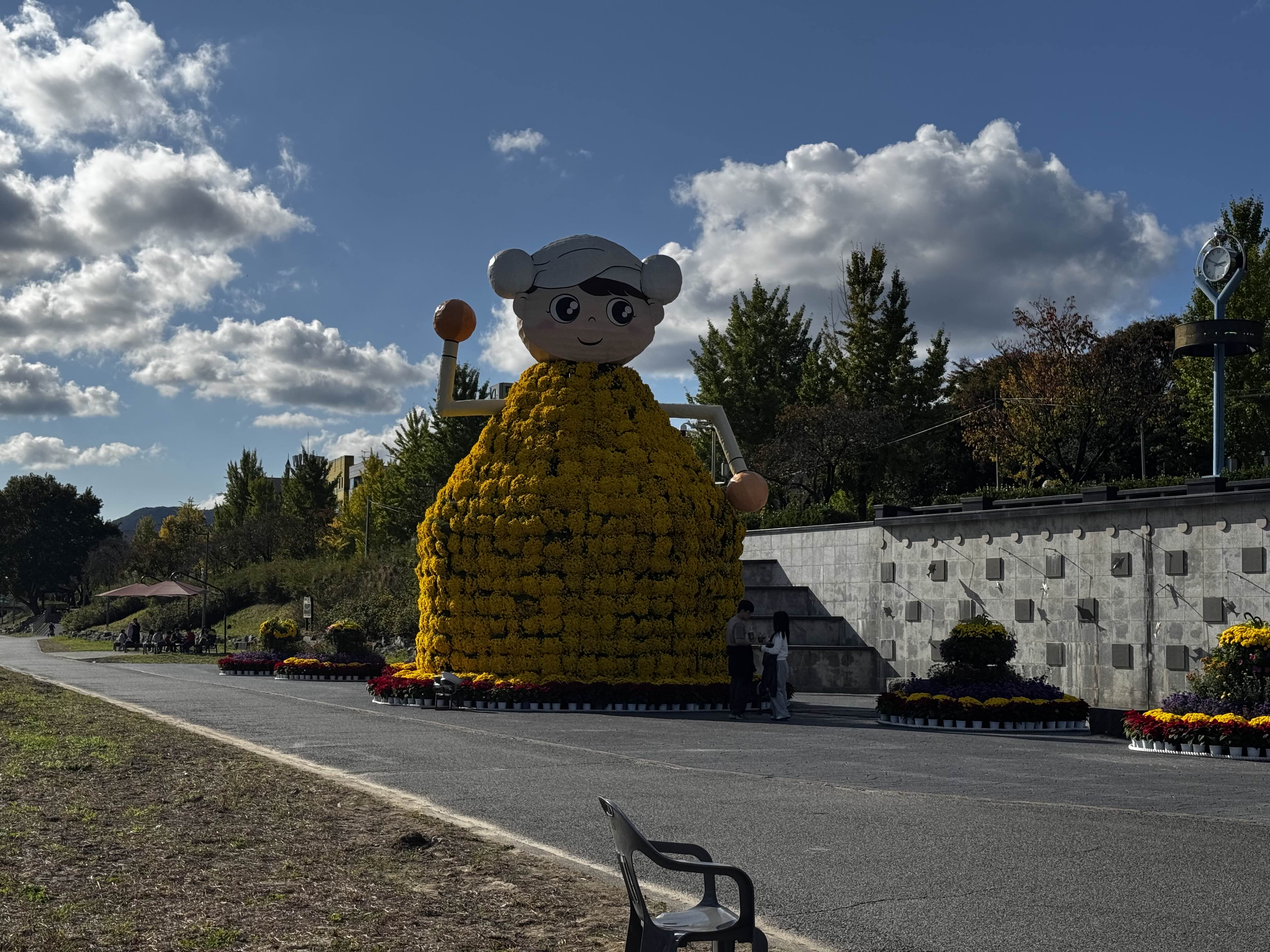 유림공원 입구는 소국이 종류별로 화분이 놓여져 있고 핑크뮬리가 뒷배경이 되었습니다.