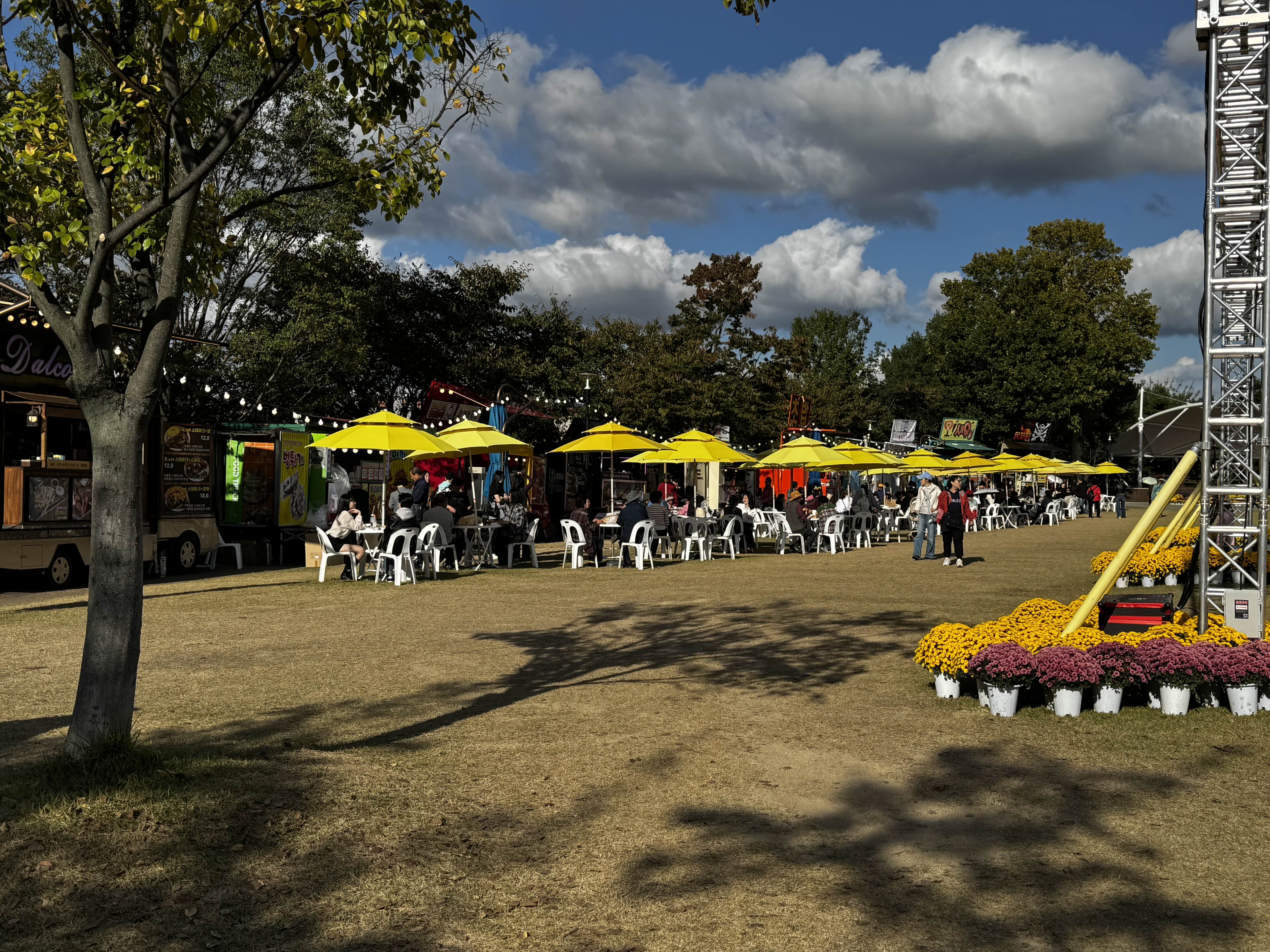 푸드트럭과 색감이 강렬한 노란색 파라솔과 벤치