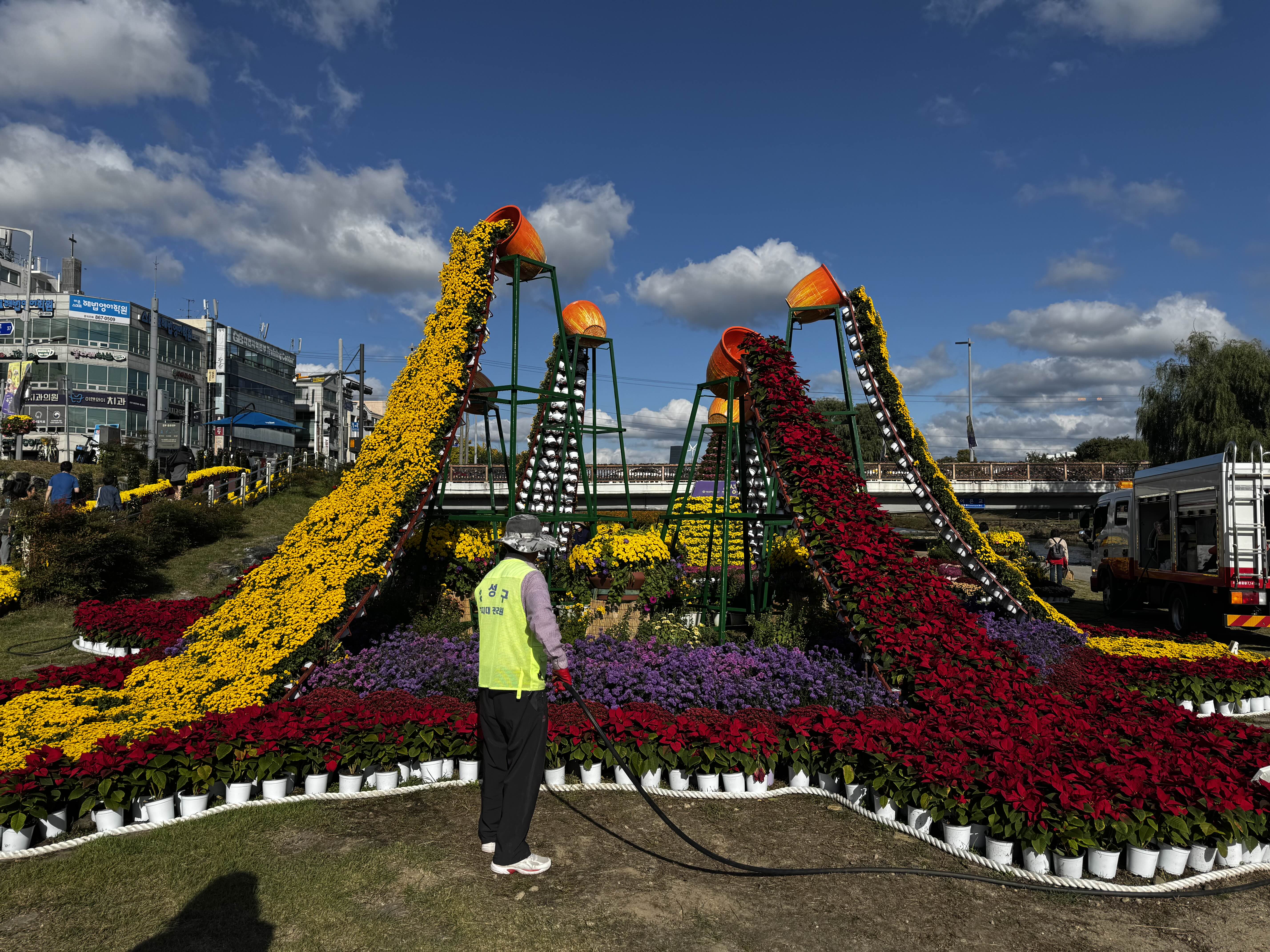 유성천변 양동이에서 꽃이 쏟아지는 경관을 연출한 조형물